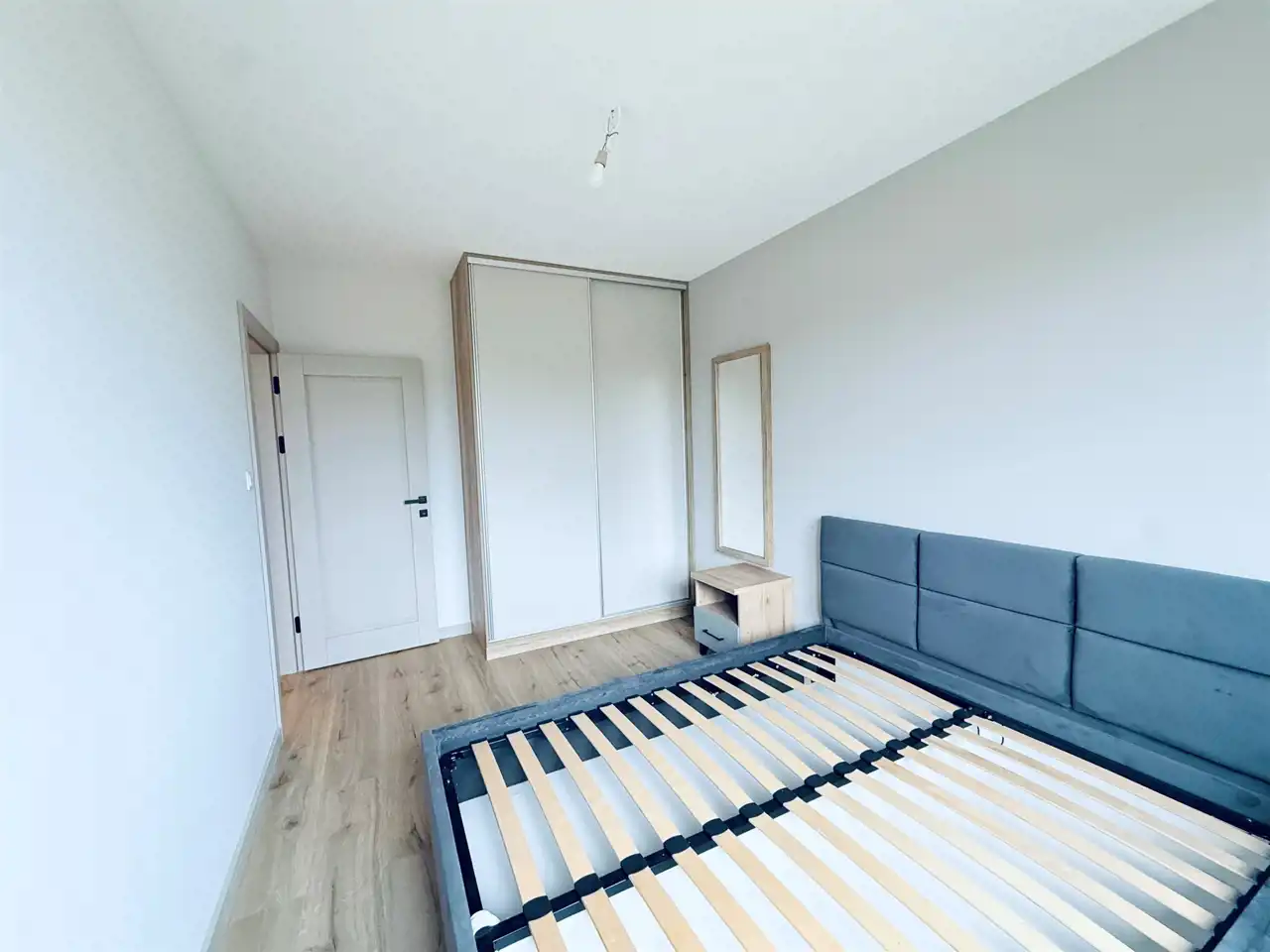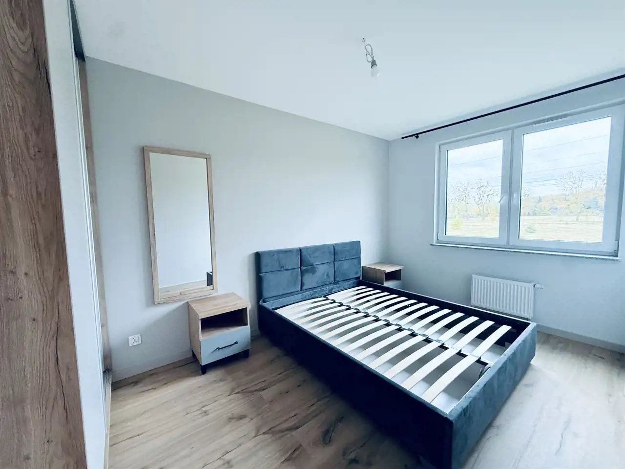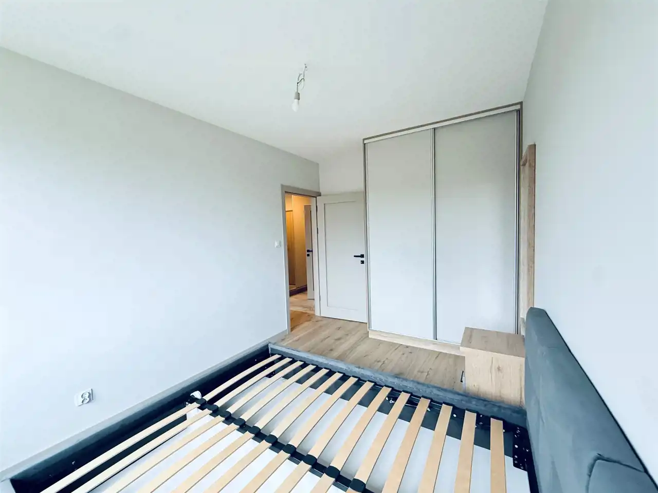 Sypialnia z oknem na stronę południową – cicha i jasna, wyposażona w szafę oraz łóżko