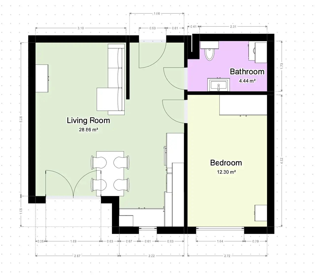 - Charakterystyka mieszkania 45.61 m2, 2 pokoje