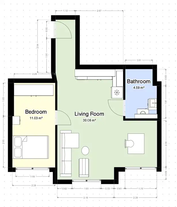 - Charakterystyka mieszkania 45.76 m2, 2 pokoje