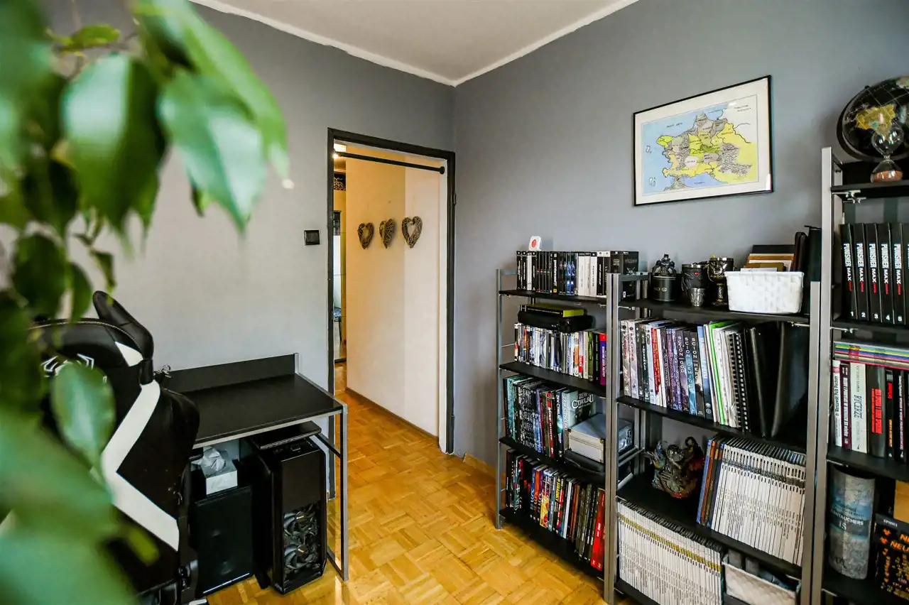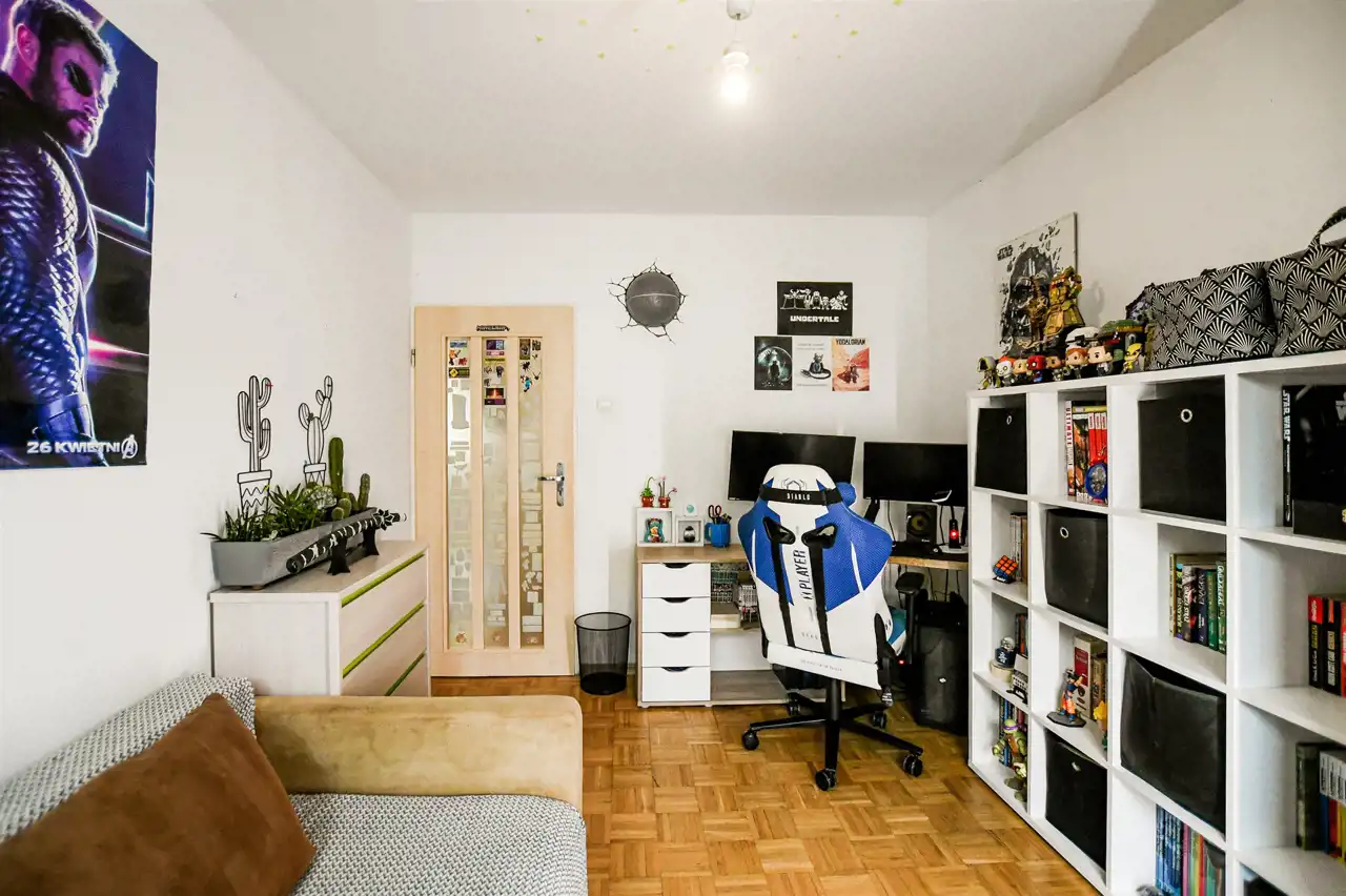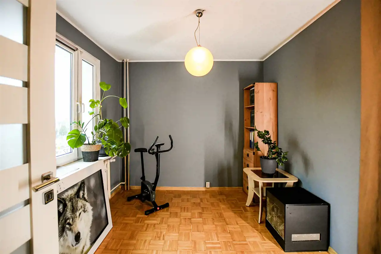 Lokal znajduje się na rynku wtórnym i jest gotowy do zamieszkania – wymaga jedynie odświeżenia. W pokojach na podłogach znajduje się solidna mozaika dębowa, ściany pokryto gładzią. Okna PCV z podwójną szybą zapewniają dobrą izolację termiczną i akustyczną. W kuchni znajduje się zabudowa meblowa, a w przedpokoju i jednej z sypialni – zabudowane szafy.