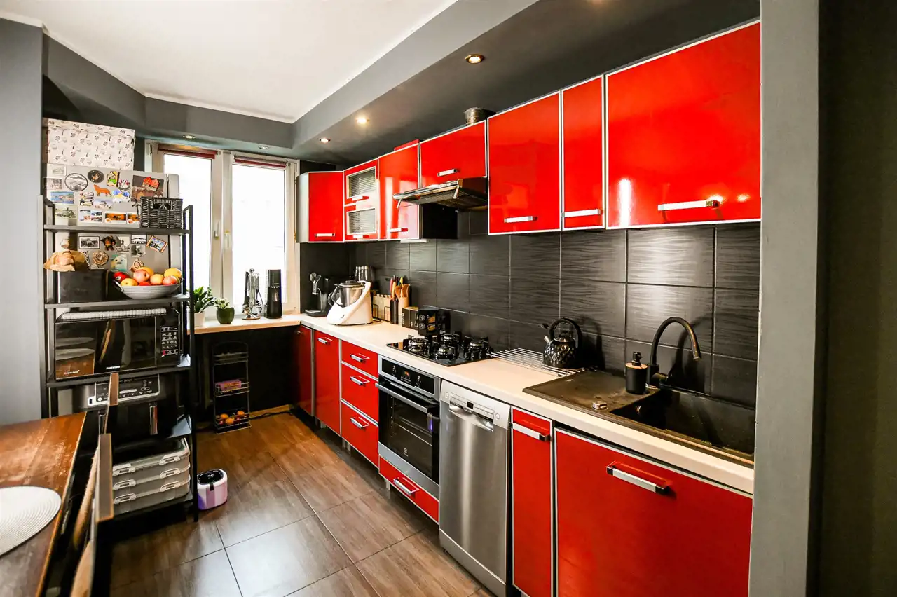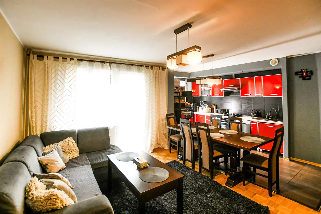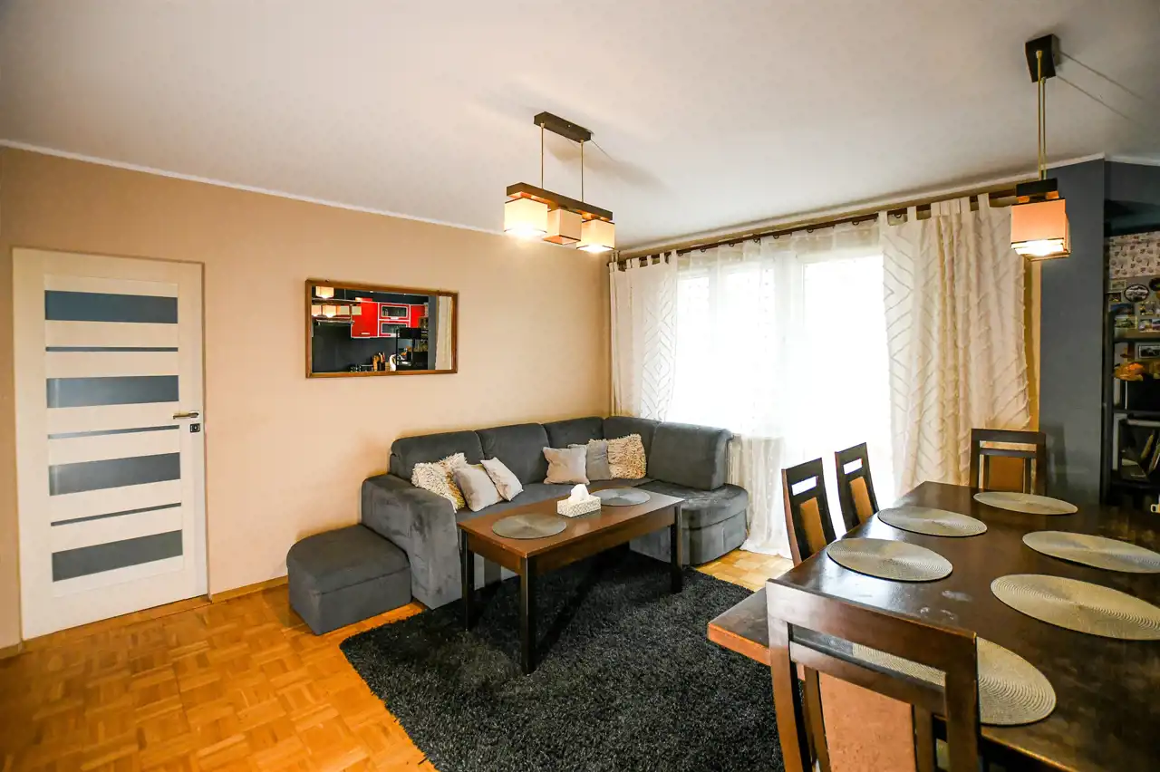 Lokal znajduje się na rynku wtórnym i jest gotowy do zamieszkania – wymaga jedynie odświeżenia. W pokojach na podłogach znajduje się solidna mozaika dębowa, ściany pokryto gładzią. Okna PCV z podwójną szybą zapewniają dobrą izolację termiczną i akustyczną. W kuchni znajduje się zabudowa meblowa, a w przedpokoju i jednej z sypialni – zabudowane szafy.