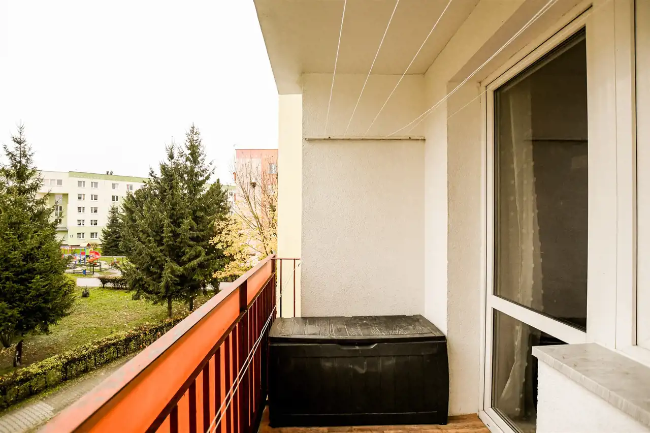 Dodatkową przestrzeń stanowi balkon o powierzchni 3,4 m² oraz piwnica o powierzchni około 5 m². Mieszkanie ma wysokość 2,5 m, co zapewnia komfort użytkowania i dobre doświetlenie pomieszczeń – szczególnie dzięki wschodniej ekspozycji okien.