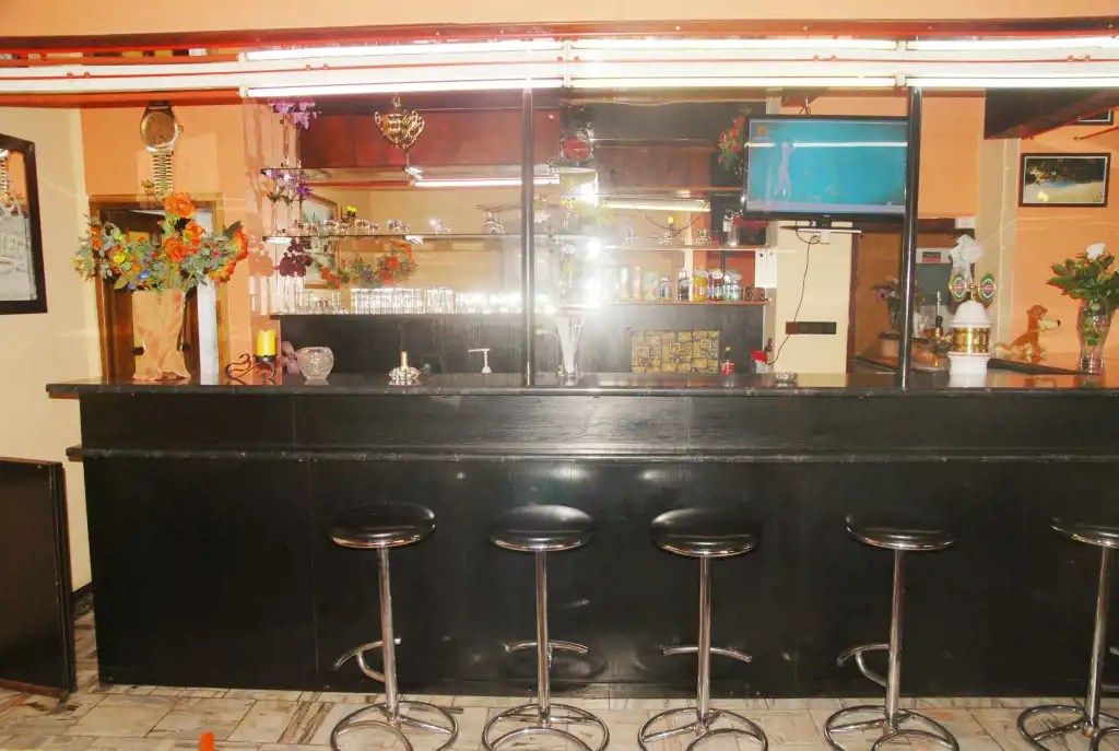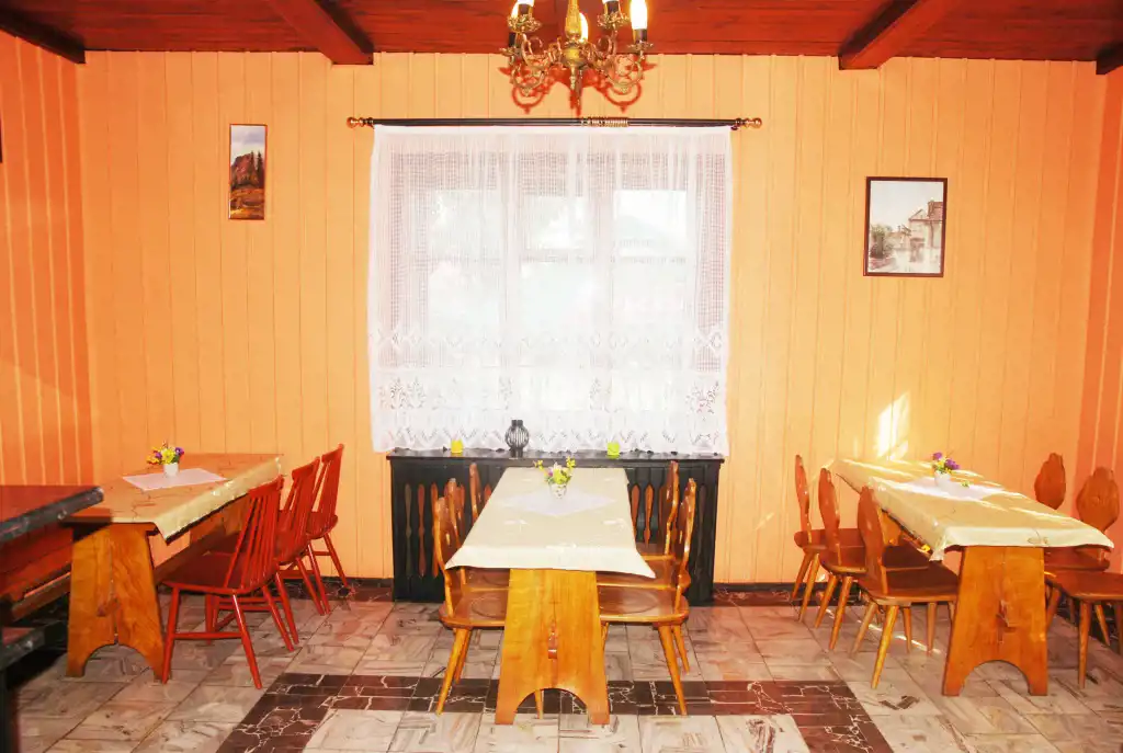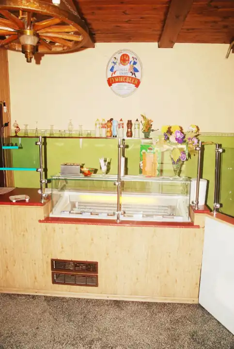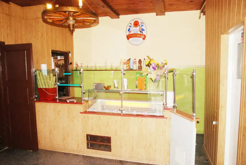 - Parter wysokość 3,2m: hall, 2 sale konsumpcyjne, pomieszczenia techniczne kuchni (zmywalnie, przygotowalnia, ponadto magazyn i skład) 2 toalety dla klientów oraz część socjalna i WC dla personelu. Na podłogach kamień.