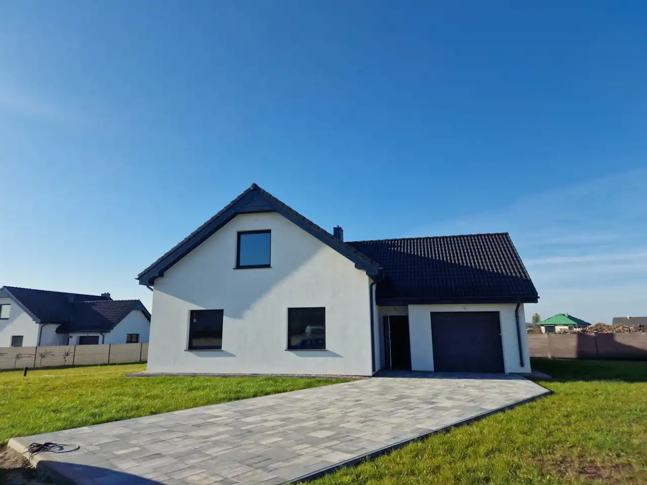 Dom został wykończony z użyciem materiałów najwyższej jakości. Starannie dobrane elementy sprawiają, że przestrzeń jest zarówno elegancka, jak i funkcjonalna.Nowoczesne oświetlenie LED w posadzce oraz w suficie podwieszanym dodaje wnętrzom wyjątkowego charakteru i ciepłej atmosfery.