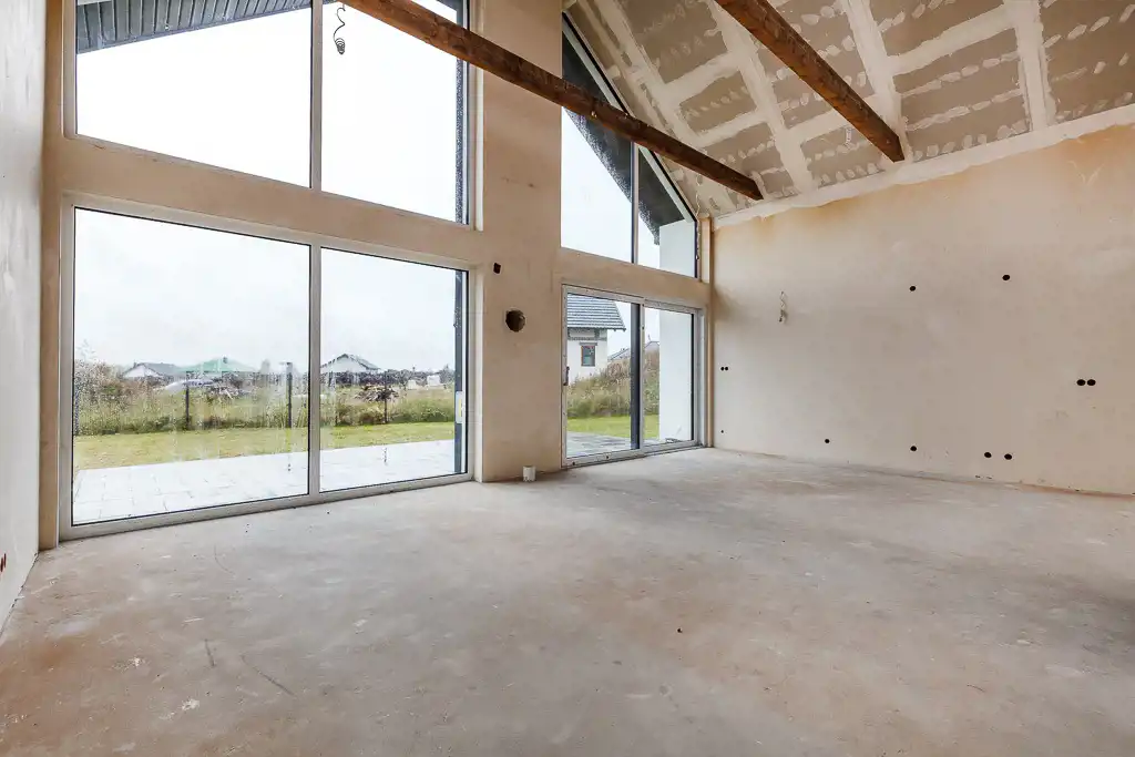 Ogromne, przeszklone przestrzenie o wysokości niemal 6 metrów dają zjawiskowe wrażenie. Energooszczędny dom z pompą ciepła i panelami fotowoltaicznymi.