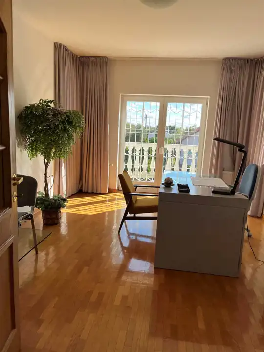 Na piętrze znajduje się gabinet z balkonem, dwie sypialnie, które mają wyjście na wspólny balkon. Są też dwie bardzo duże sypialnie, które obecnie pełnią rolę pokoju bilardowego, a druga siłowni.
