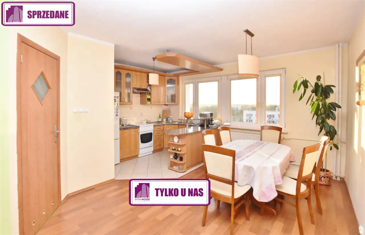 Trzypokojowe mieszkanie przebudowane na otwarte, komfortowe i funkcjonalne z widną i wyposażoną kuchnią połączoną z jadalnią, która powstała poprzez zaadaptowanie jednego z pokoi. Pozostałe pomieszczenia to sypialnia, salon z wyjściem na loggię, łazienka i przedpokój. Podłoga w kuchni z płytek gres, w łazience i przedpokoju położona terakota, w pokojach panele. Jadalnia otwarta oddzielona od pokoju dziennego przestrzenią z podwieszonym sufitem z oświetleniem Led oraz położonym na podłodze miedzy panelami 1,5 m pasem z terakoty. W łazience jasna glazura z obudowaną wanną. W sypialni szafa na wymiar z lustrem jako jednym z trzech przesuwnych skrzydeł. W korytarzu wieszak, szafki na buty oraz pawlacze. Drzwi wejściowe antywłamaniowe.
