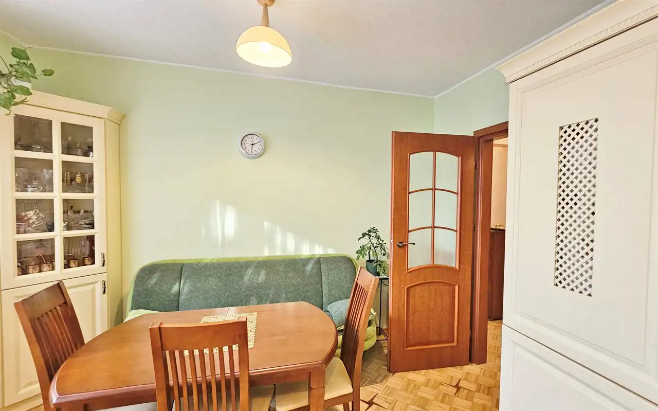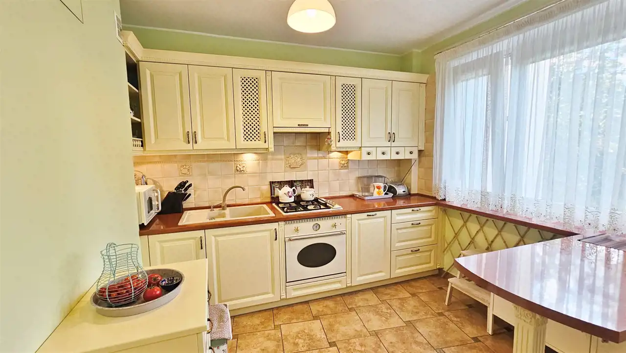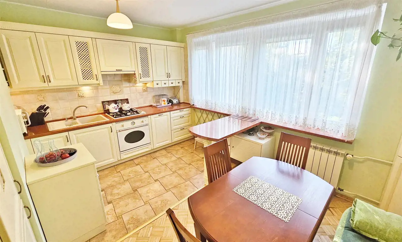 Sercem mieszkania jest kuchnia z jadalnią stanowiąca oddzielne, jasne pomieszczenie, w którym dominuje estetyczna zabudowa kuchenna. To idealne miejsce na wspólne posiłki i wieczorne rozmowy.