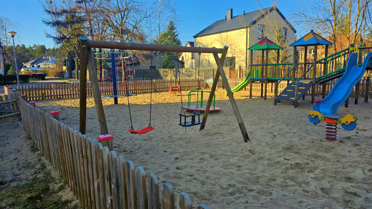 budynek otoczony zielenią w okolicy skwer seniora, plac zabaw