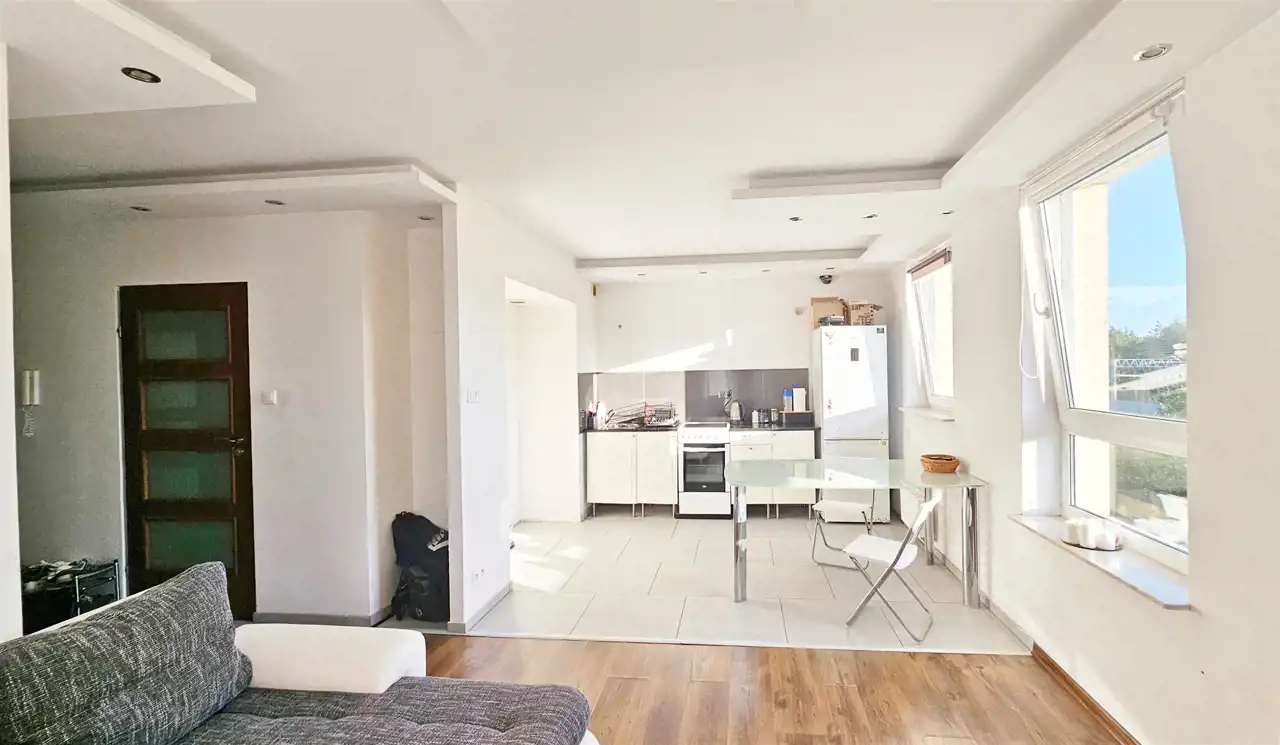 - Pokój dzienny połączony z kuchnią - przestronna i jasna część wspólna , idealna do aranżacji zarówno strefy wypoczynkowej , jak i jadalnej.