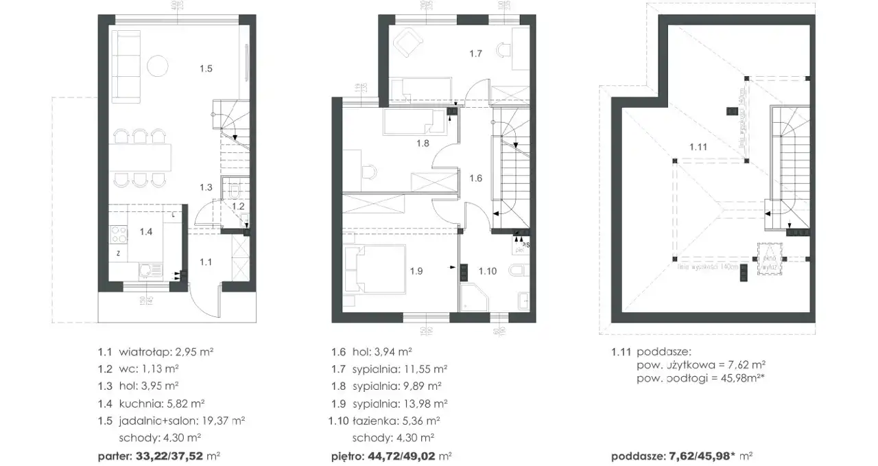 Parter budynku to przestronny salon z aneksem kuchennym o powierzchni łącznej 26m2. Poziom ten uzupełniają przedpokój oraz wc. Na drugim poziomie odnajdziemy trzy sypialnie 14m2;12m2 i 9m2 oraz dużą 6m2 łazienkę. Do dyspozycji mamy również strych, gdzie odnajdziemy przestrzeń, gdzie możemy zaaranżować kolejne pomieszczenia.