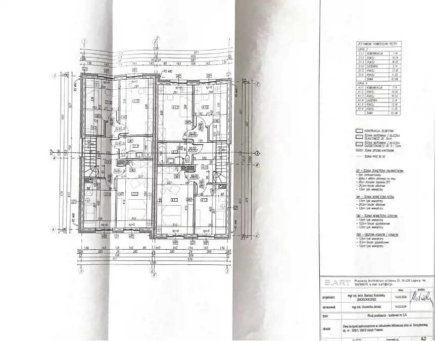 Na każdą z działek został sporządzony projekt budynku mieszkalnego jednorodzinnego o powierzchni ok. 123 m2 w zabudowie bliźniaczej bez podpiwniczenia z dachem spadowym z 2 miejscami postojowymi w garażu wbudowanym oraz przed budynkiem na terenie utwardzonym.