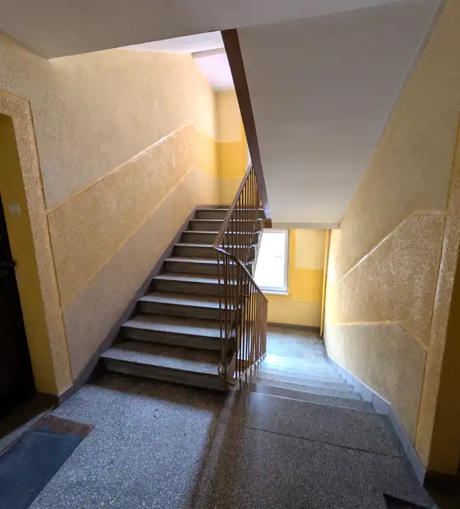 Mieszkanie znajduje się na II piętrze w X piętrowym wieżowcu. Lokal składa się z przestronnego pokoju i osobnej kuchni, łazienki z wanną i WC oraz przedpokoju; jest jednostronne, rozkładowe i ustawne. Do mieszkania przynależy piwnica. Przed budynkiem jest dostępny dla mieszkańców parking za szlabanem. Mieszkanie jest przeznaczone do odświeżenia/remontu.