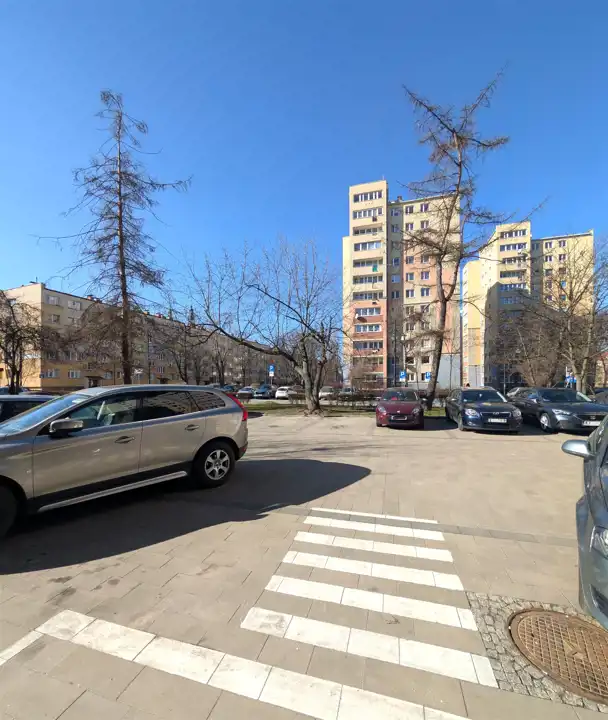 Budynek: ocieplony wieżowiec z windą, drzwi z domofonem, miejsca parkingowe przed budynkiem
