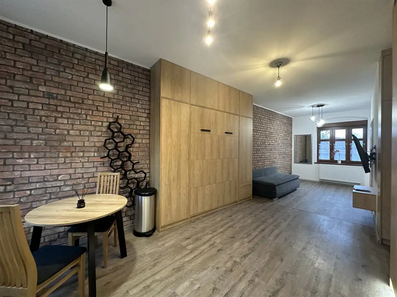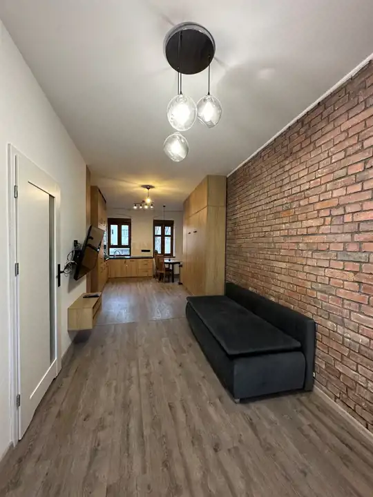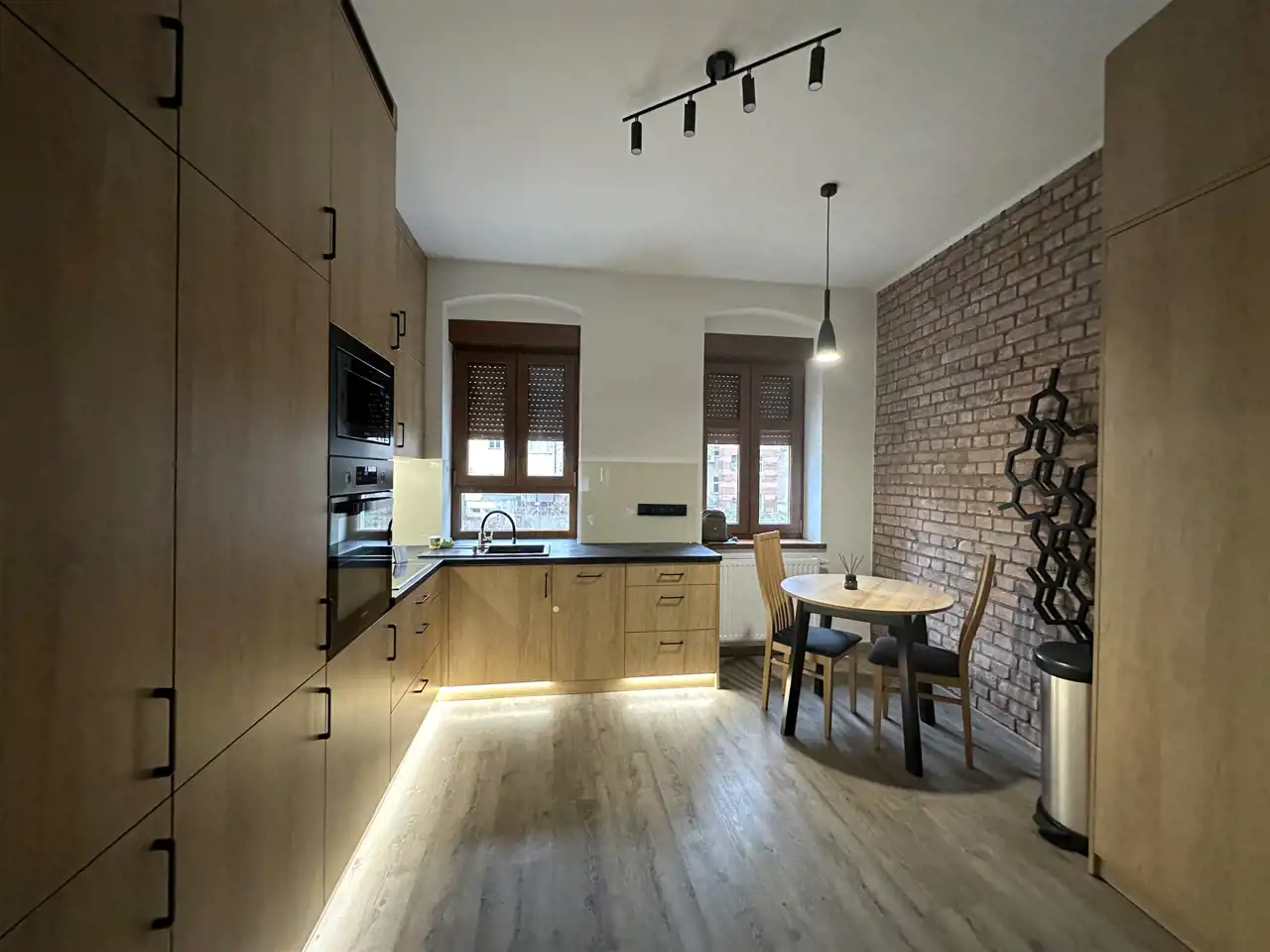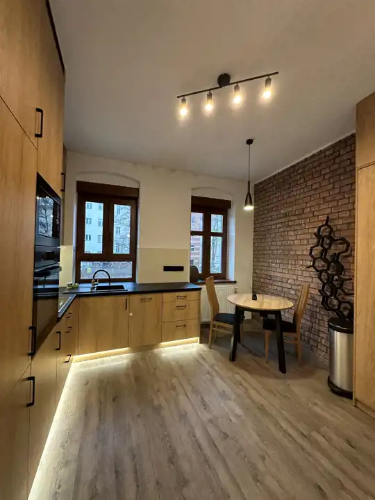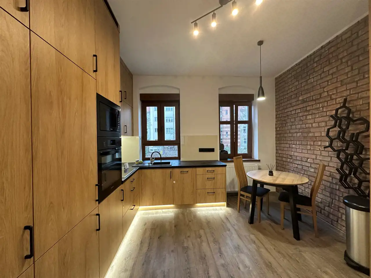 Mieszkanie zachwyca przytulnym, stylowym wnętrzem, w którym nowoczesność spotyka się z naturalnymi materiałami. Drewniana zabudowa meblowa, ceglana ściana oraz panele winylowe tworzą spójną, ciepłą przestrzeń idealną dla jednej osoby lub pary.