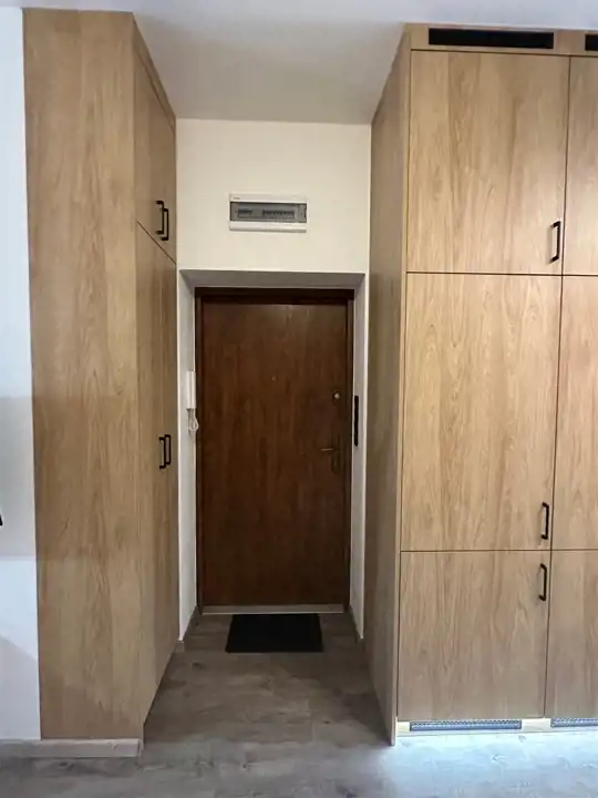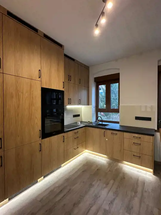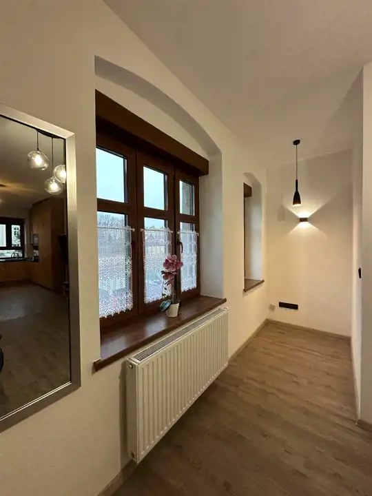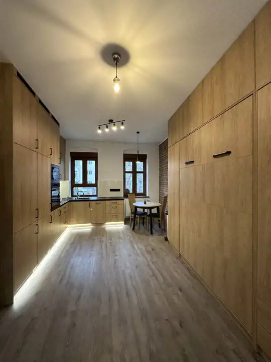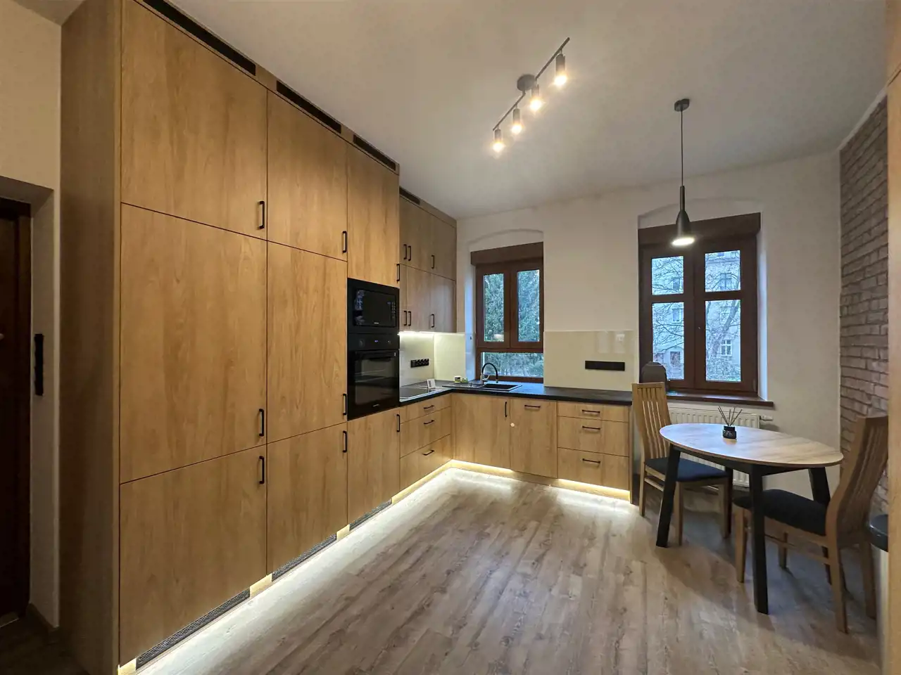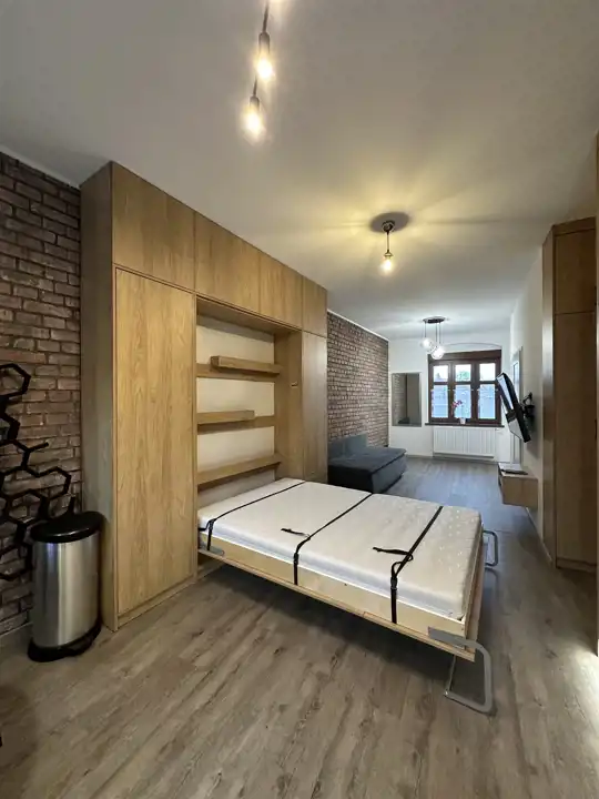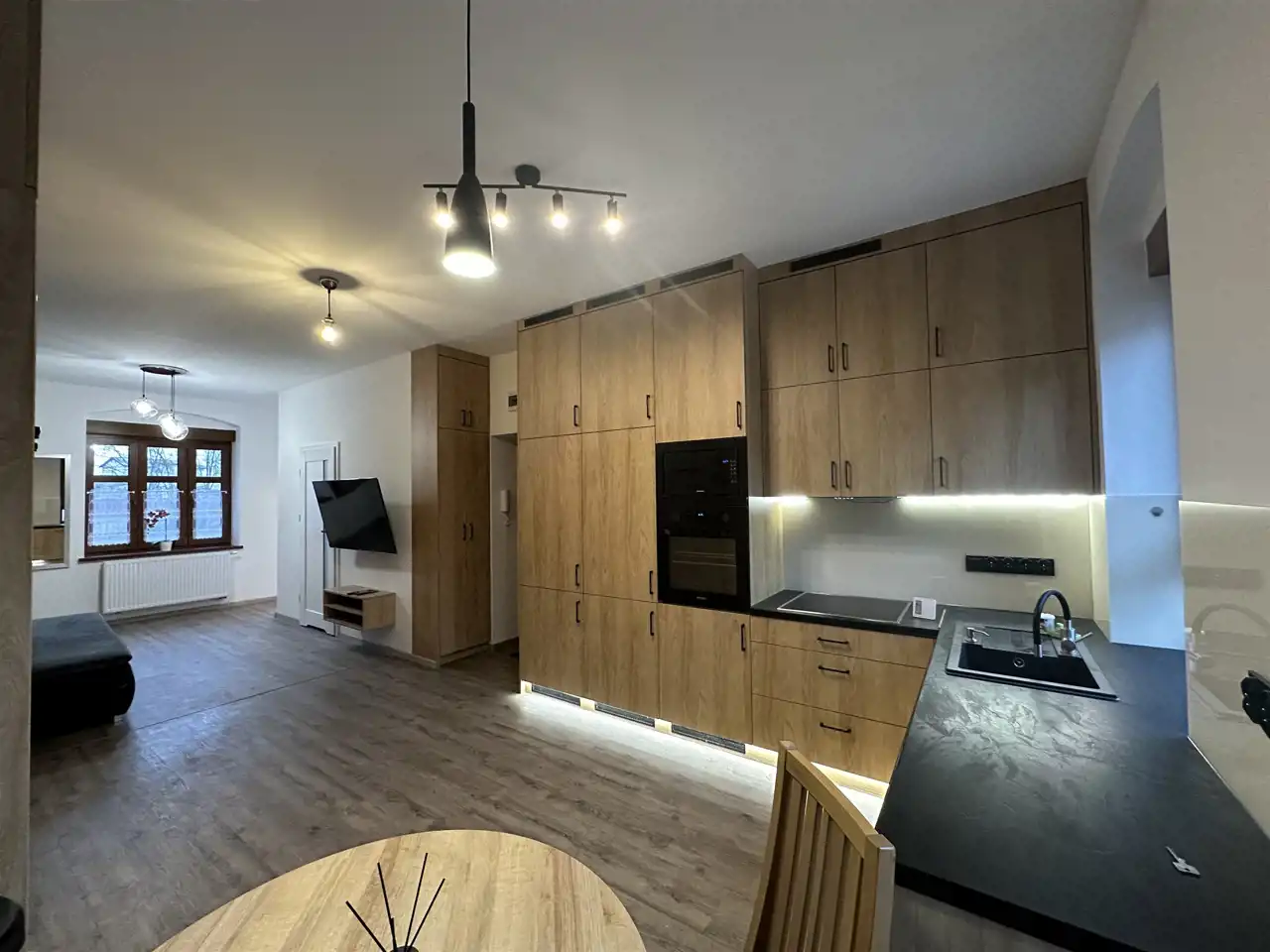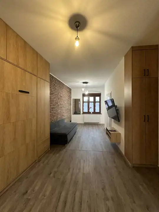 Mieszkanie zachwyca przytulnym, stylowym wnętrzem, w którym nowoczesność spotyka się z naturalnymi materiałami. Drewniana zabudowa meblowa, ceglana ściana oraz panele winylowe tworzą spójną, ciepłą przestrzeń idealną dla jednej osoby lub pary.