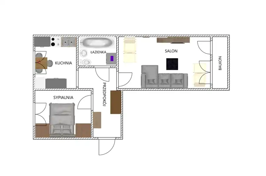 Lokal składa się z salonu (ok. 18 m2) z miejscem na stół jadalny i wygodną część wypoczynkową oraz wyjściem na balkon (3 m2). Dodatkowo ustawna sypiania (ok. 12,30 m2), jasna kuchnia (ok. 8 m2) z zabudową meblową, przedpokój (ok. 9,5 m2) z szafą, łazienka (3,5 m2) z wanną.