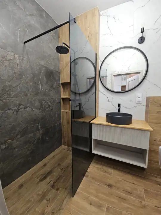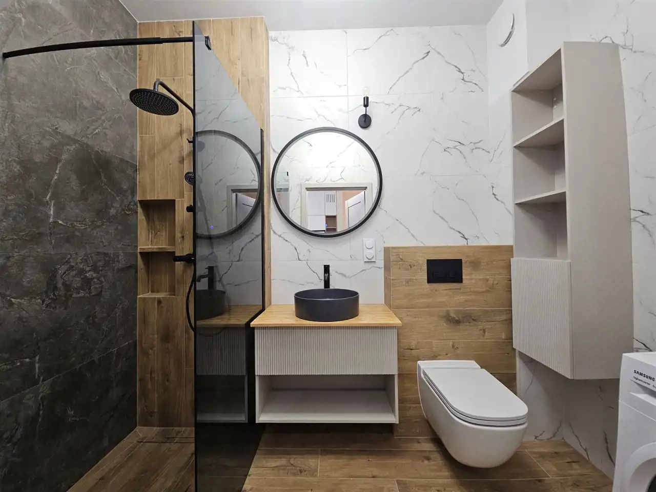 - łazienki w nowoczesnej aranżacji, prysznic, pralka