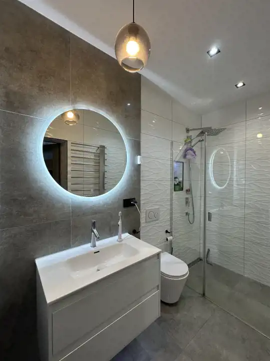 - nowoczesna łazienka wykończona w wysokiej jakości płytkach, wyposażona w przestronny prysznic