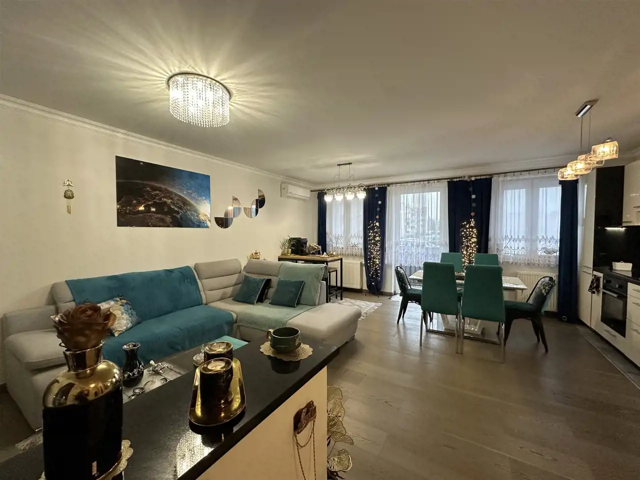 Mieszkanie o powierzchni ok. 50 m² zostało zaprojektowane w otwartym układzie, który nadaje wnętrzu przestronności i lekkości. Centralnym punktem jest duży, jasny salon połączony z kuchnią, wykończony gustownie i z dbałością o detale.