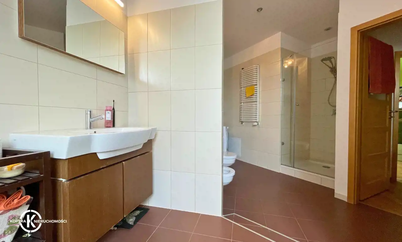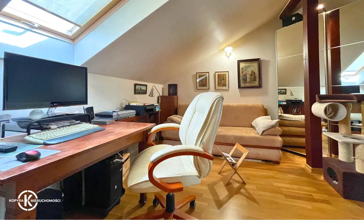 - Drugie piętro: Duża łazienka podzielona na dwie części - jedna z wanną i umywalką, druga z kabiną prysznicową, toaletą i bidetem. Dodatkowo na tym poziomie znajduje się przestronne biuro/gabinet oraz komfortowa sypialnia, zapewniająca idealne warunki do wypoczynku.