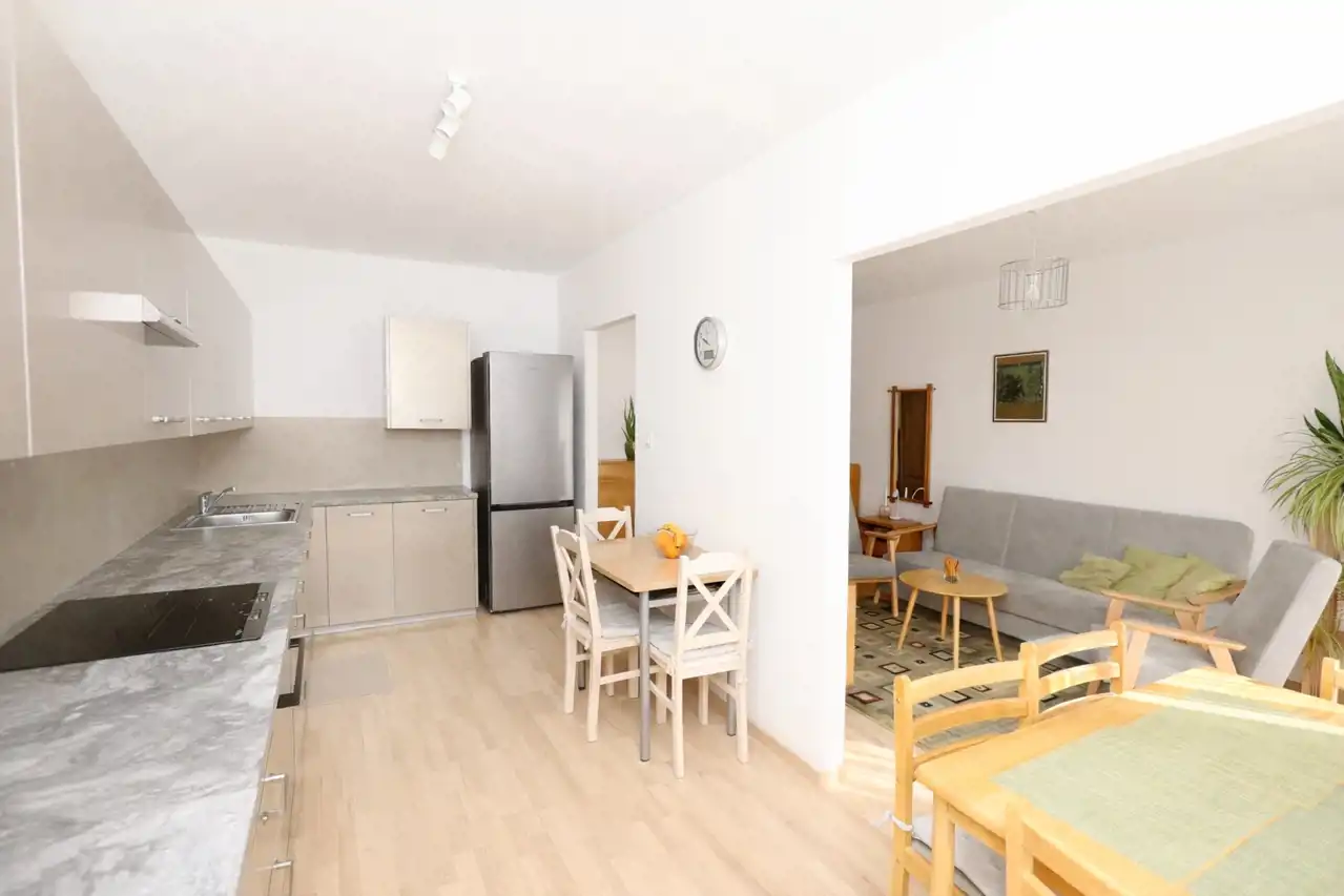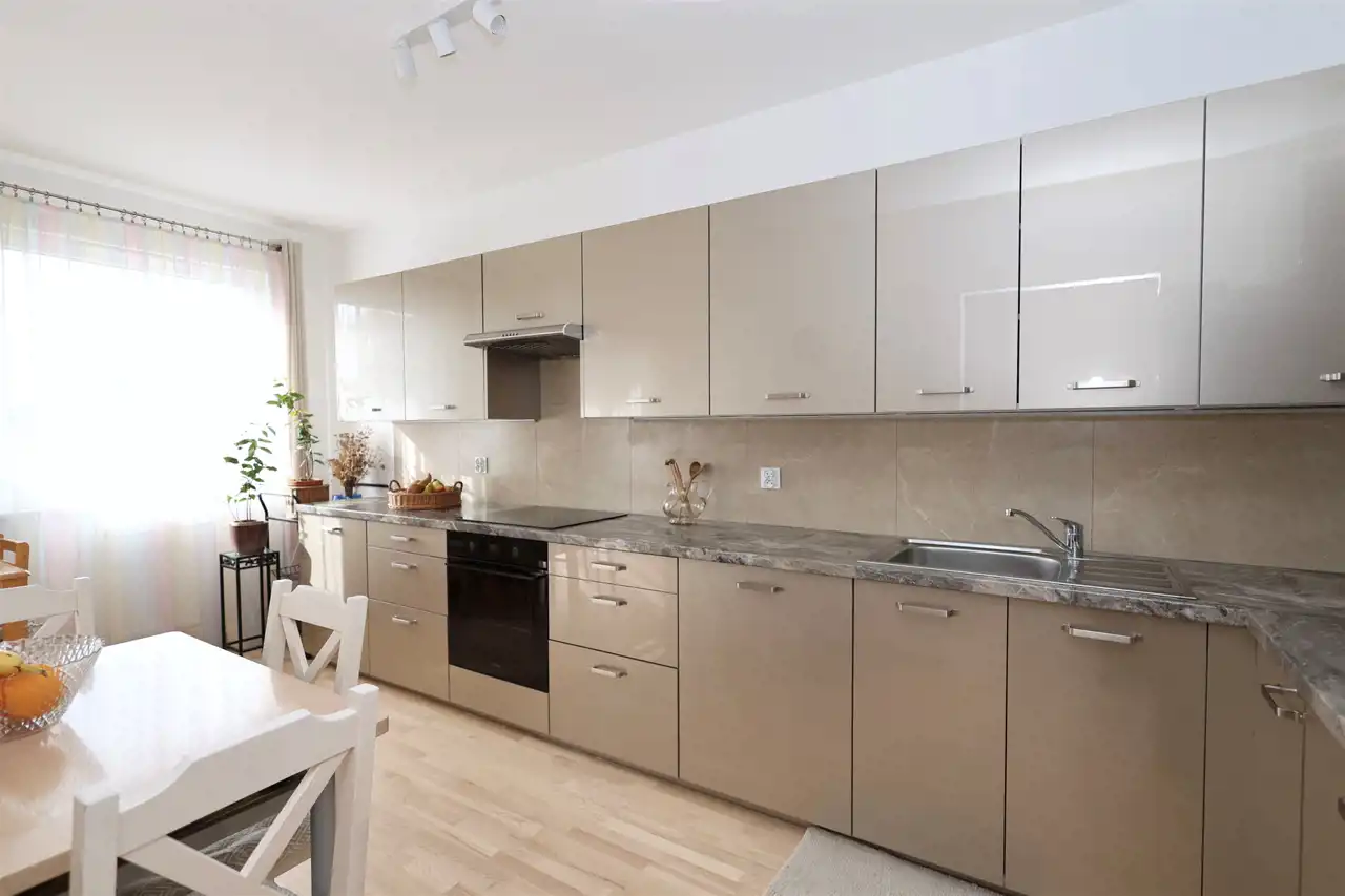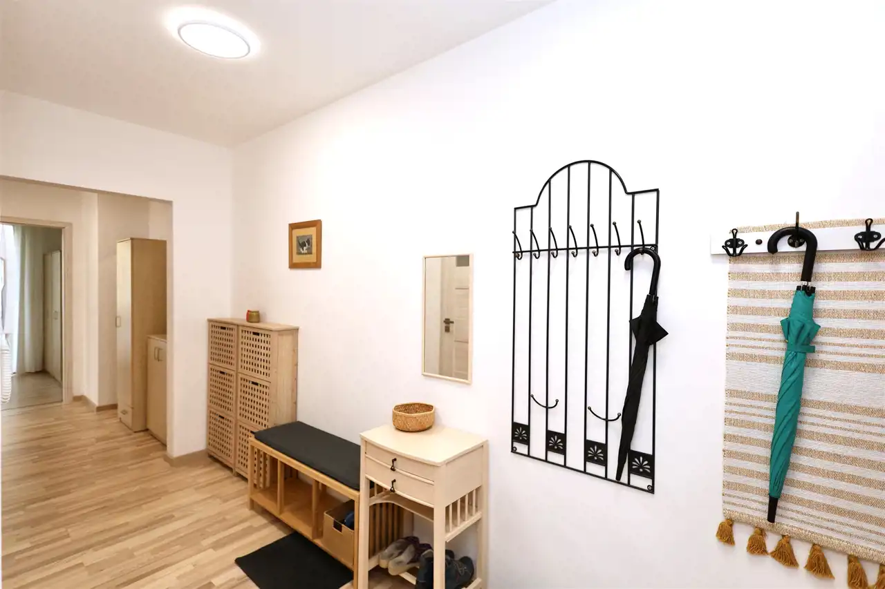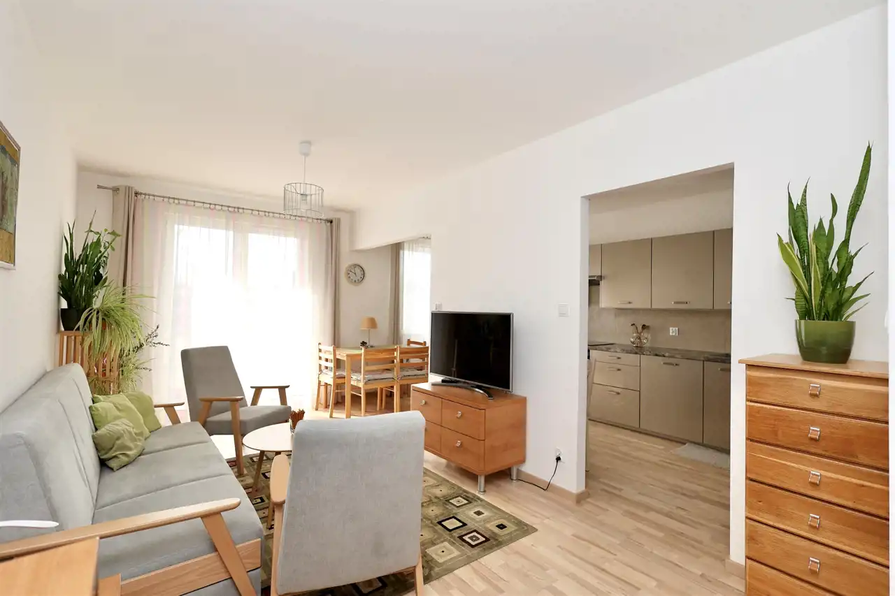 Mieszkanie zostało zaprojektowane w bardzo praktycznym układzie, który wyraźnie oddziela strefę dzienną od prywatnej. Centralnym miejscem mieszkania jest jasny i przestronny salon częściowo połączony z kuchnią, tworzący przyjazną przestrzeń do codziennego życia oraz spotkań z rodziną i przyjaciółmi.