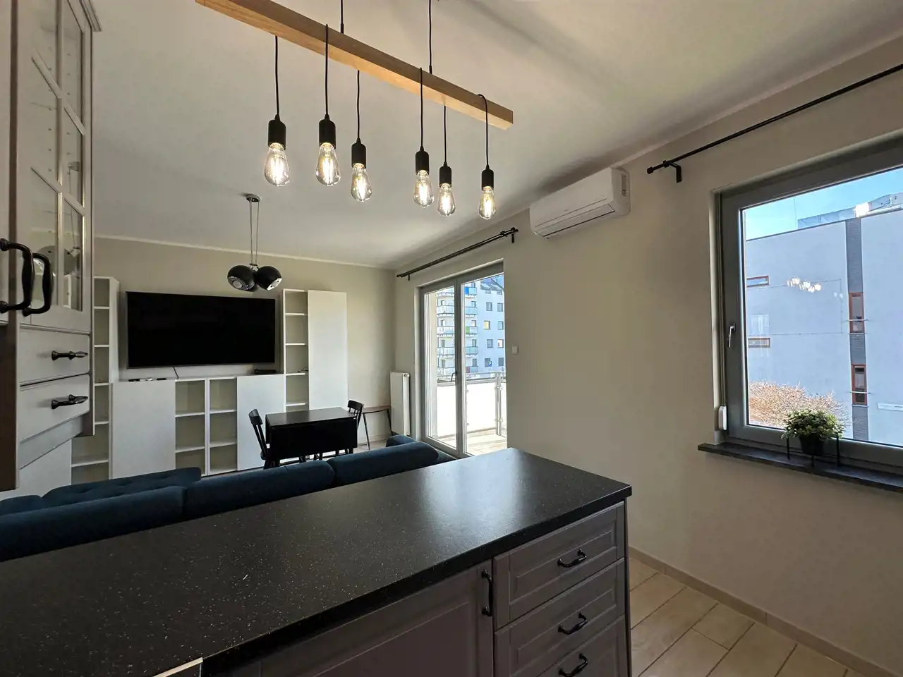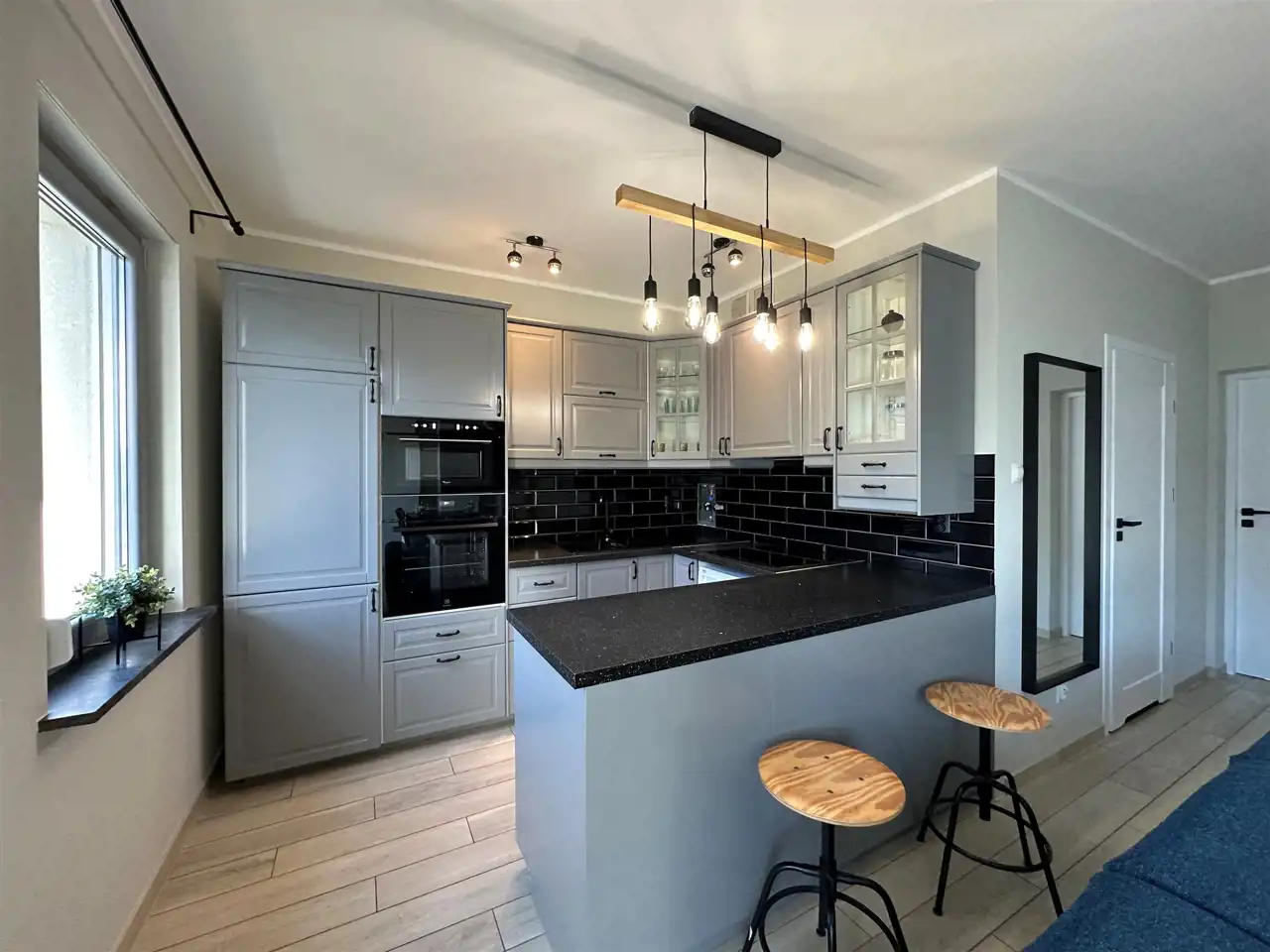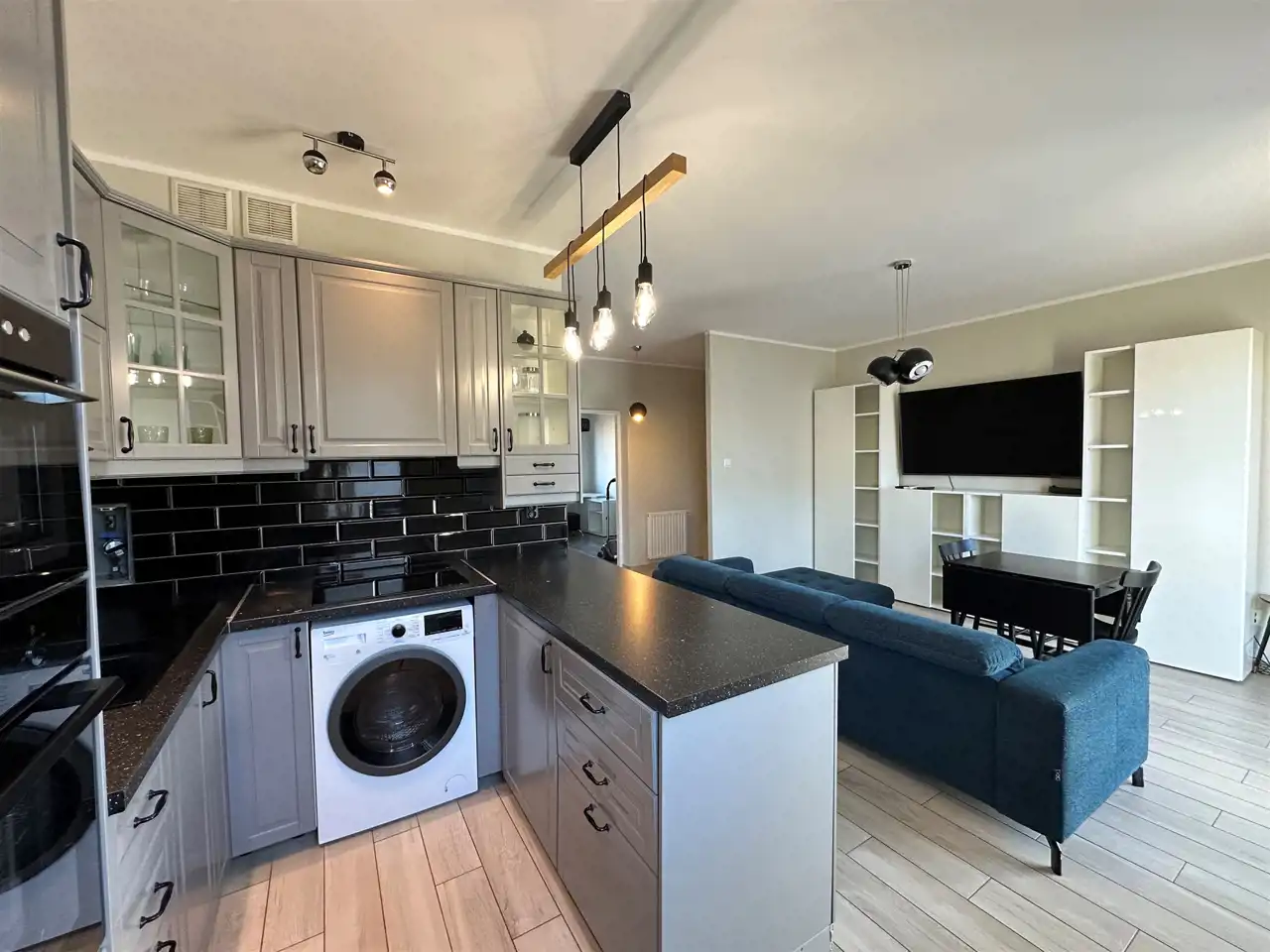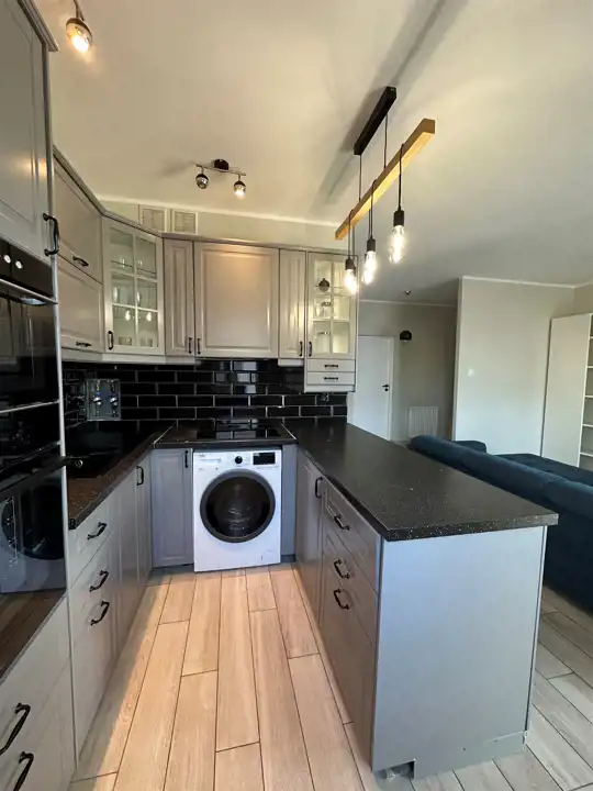 Mieszkanie urządzone w nowoczesnym stylu, przeważają jasne kolory, ciekawe oświetlenie i dodatki wpływają na ciepły klimat wnętrza. Na wyposażeniu sprzęt AGD: pralka, lodówka, piekarnik, płyta indukcyjna, zmywarka i wszystkie meble widoczne na zdjęciach.