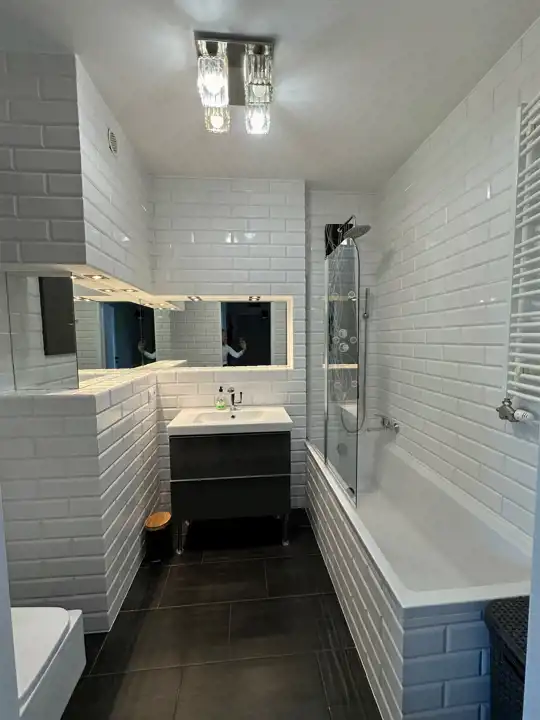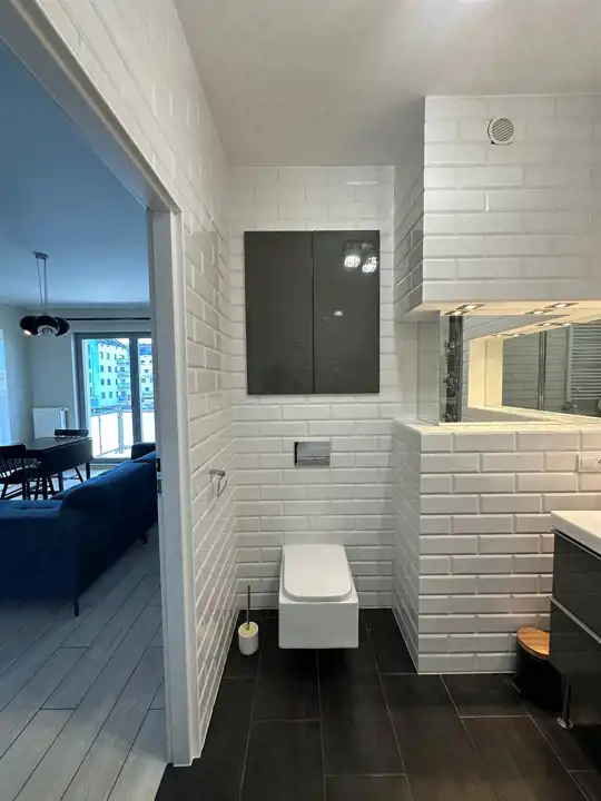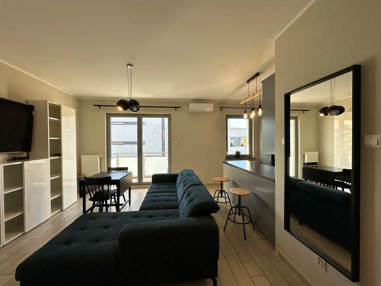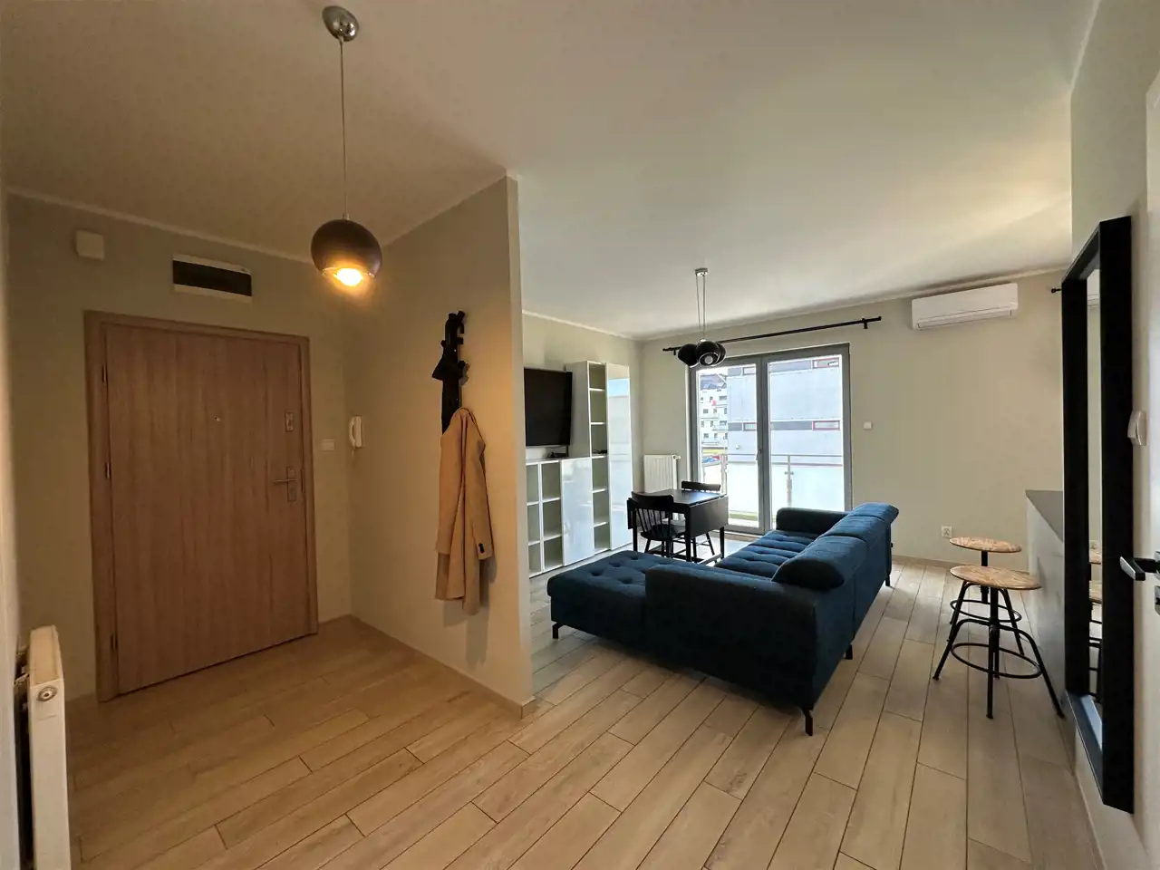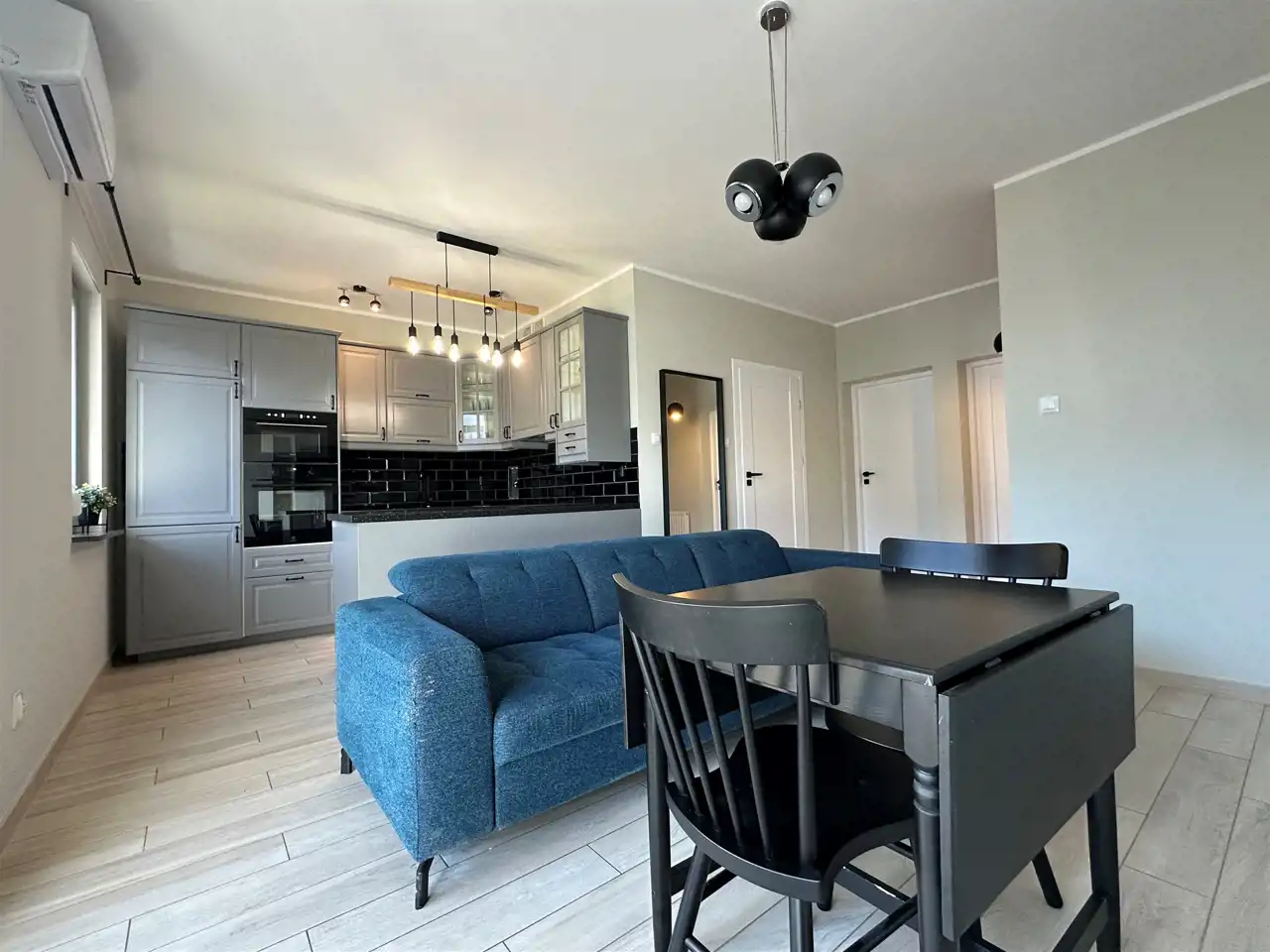Mieszkanie urządzone w nowoczesnym stylu, przeważają jasne kolory, ciekawe oświetlenie i dodatki wpływają na ciepły klimat wnętrza. Na wyposażeniu sprzęt AGD: pralka, lodówka, piekarnik, płyta indukcyjna, zmywarka i wszystkie meble widoczne na zdjęciach.