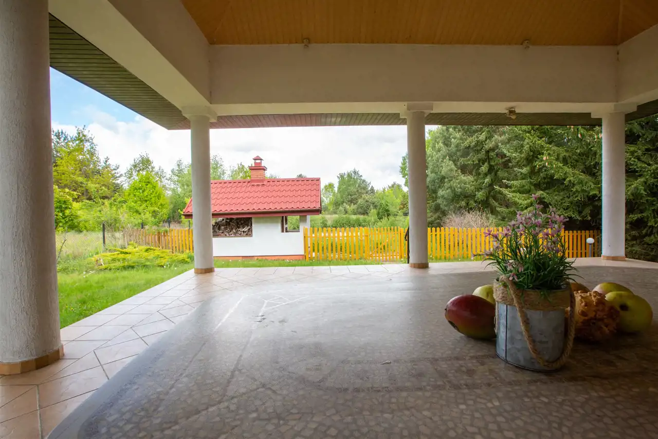 Taras /wyjście z salonu na parterze / zadaszony/ ok. 50 mkw / z widokiem na staw i ogród/;