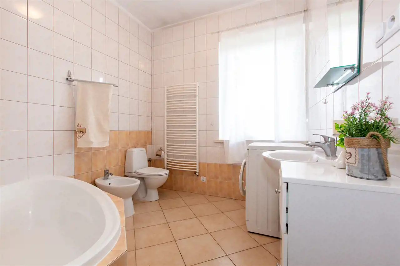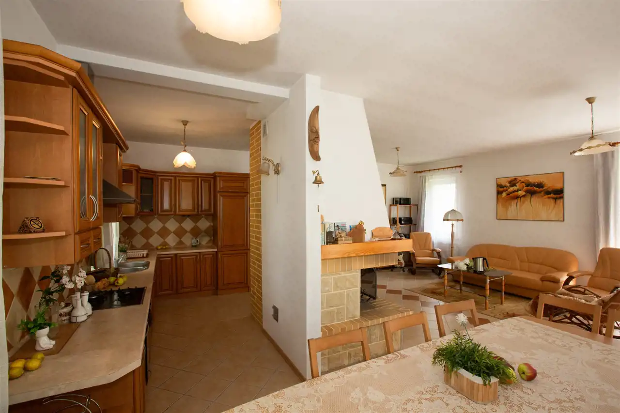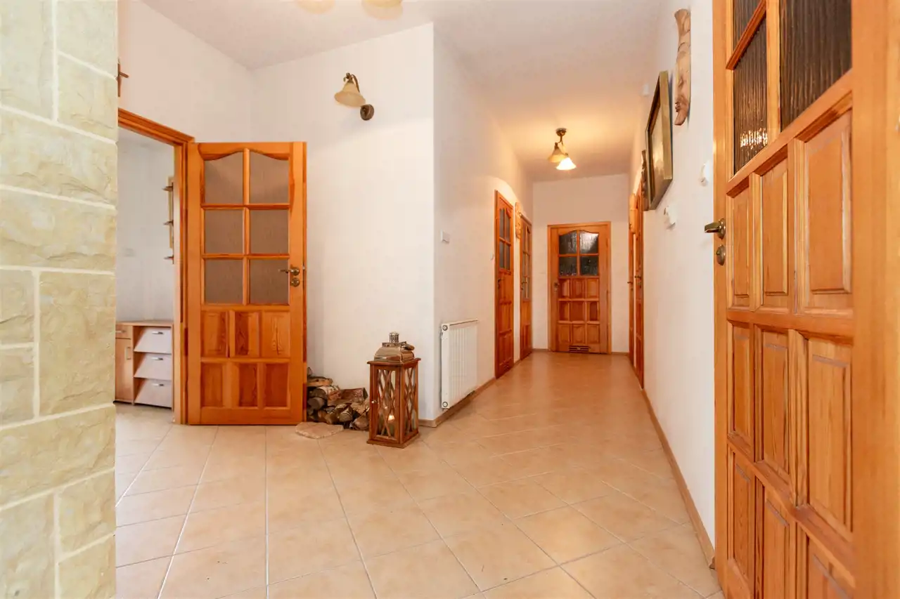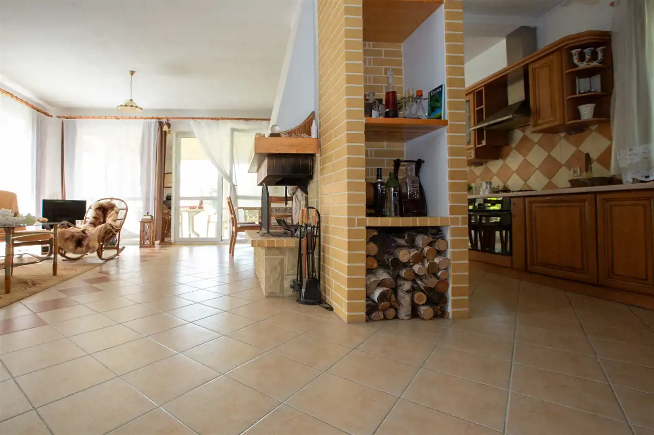 Parter ok 120 mkw. ( salon , kuchnia , 3 pokoje/sypialnie / , 2 łazienki- jedna z wanną ,bidetem druga z kabiną prysznicową) , kominek otwarty( z trzech stron ) oddzielający część kuchenną od salonu,duża garderoba z oknem,pomieszczenie gospodarcze