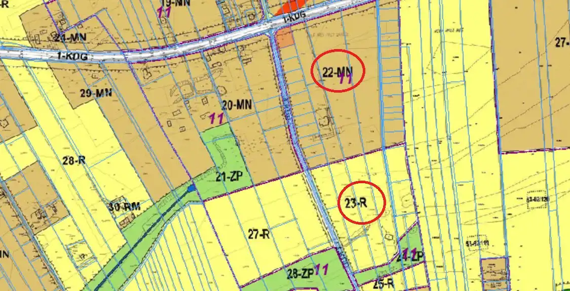 Dwie działki o większej powierzchni objęte są oznaczeniem 23-R (zabudowa zagrodowa):