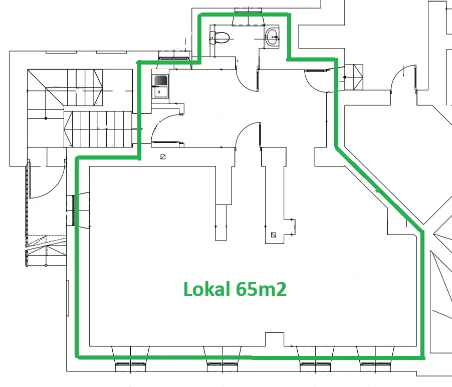 Powierzchnie biurowo-usługowa w przyziemiu kamienicy. Lokal o powierzchni 65m2 składający się z dwóch pomieszczeń usługowo-biurowych, przedpokoju z aneksem kuchennym i toalety.