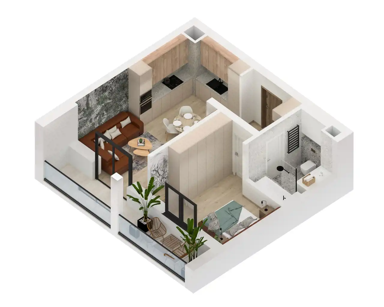 - Charakterystyka mieszkania 46.34 m2, 2 pokoje