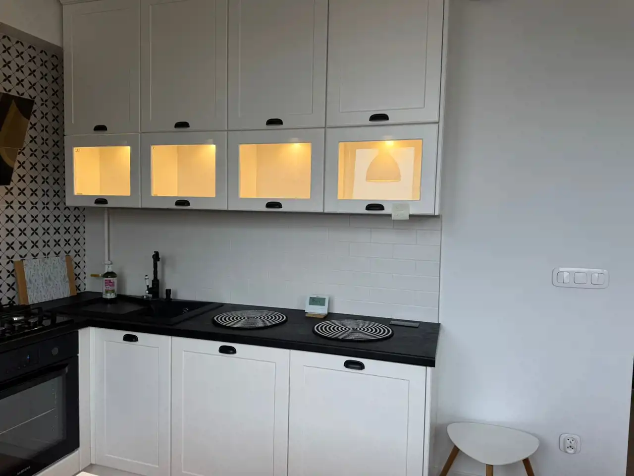- Salon z aneksem kuchennym: lodówka, płyta gazowa, piekarnik, okap, meble na wymiar, stół z krzesłami, kanapa, fotel, szafka;