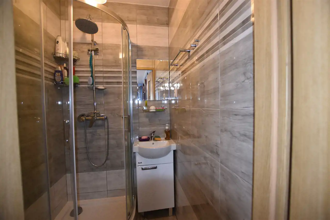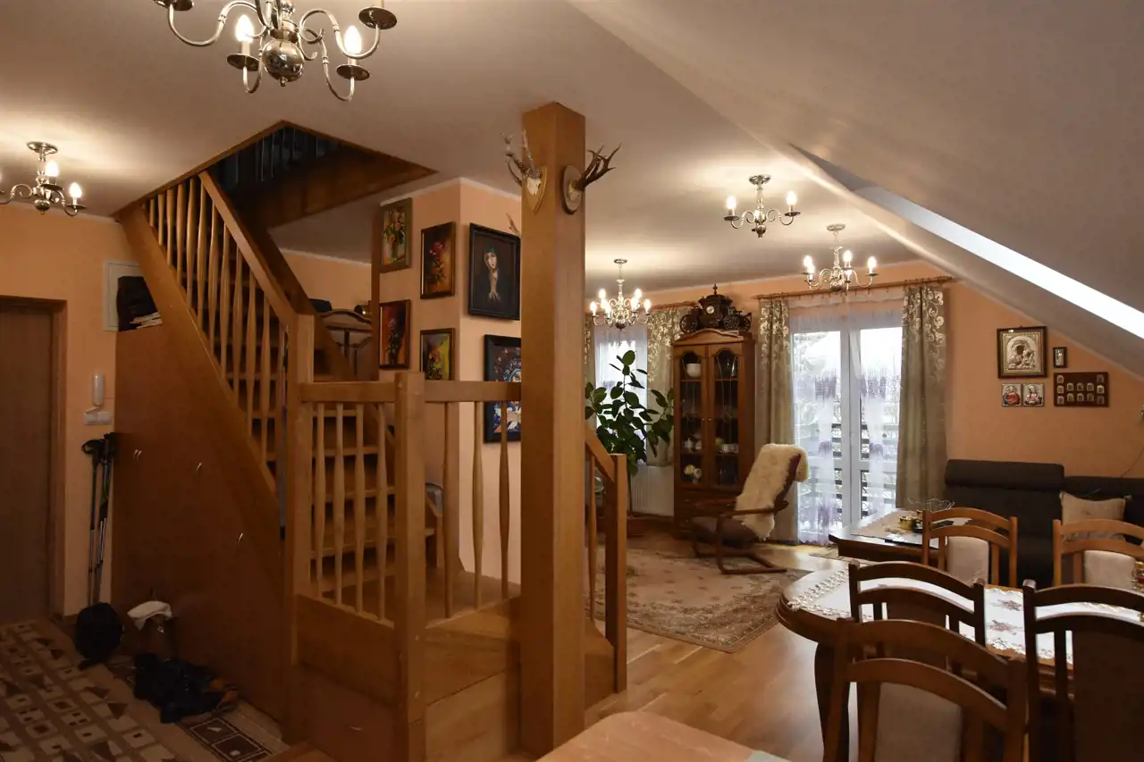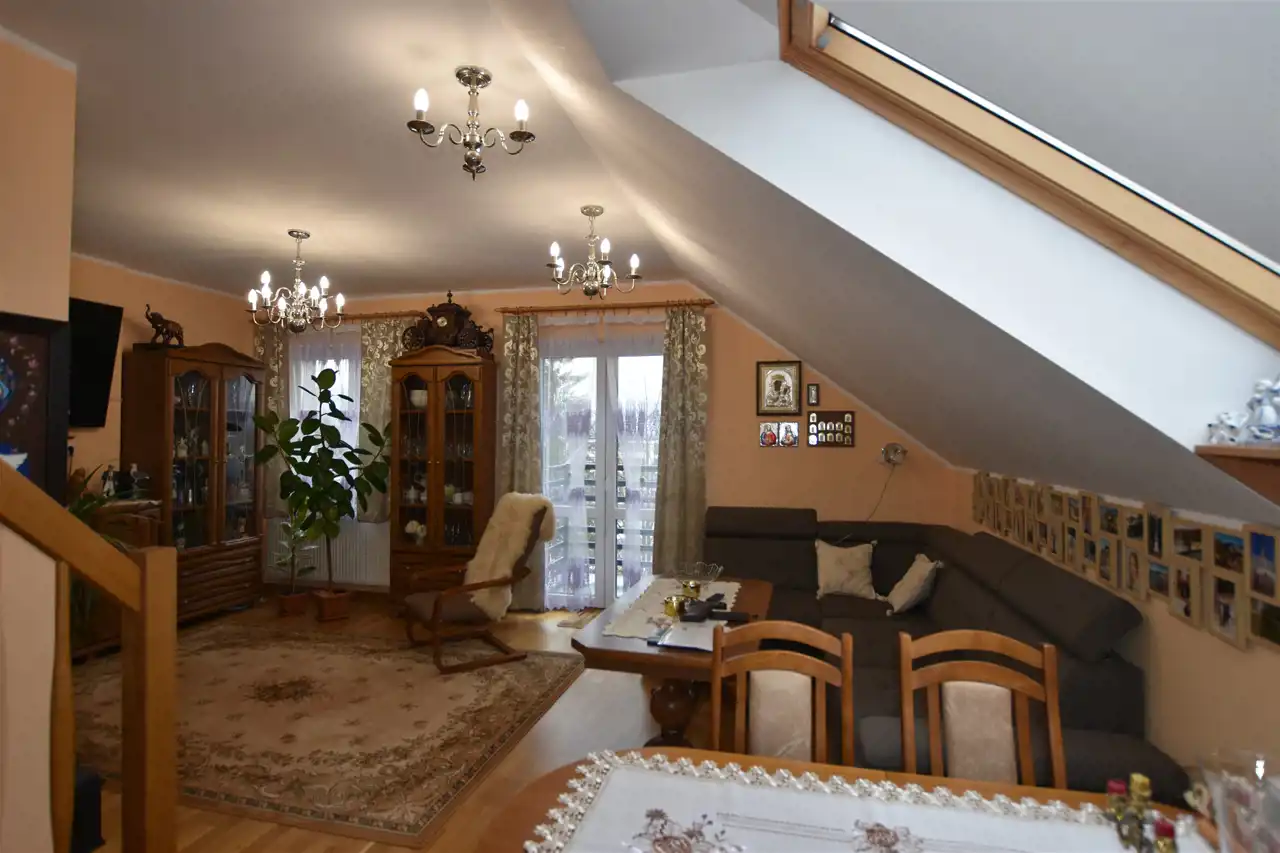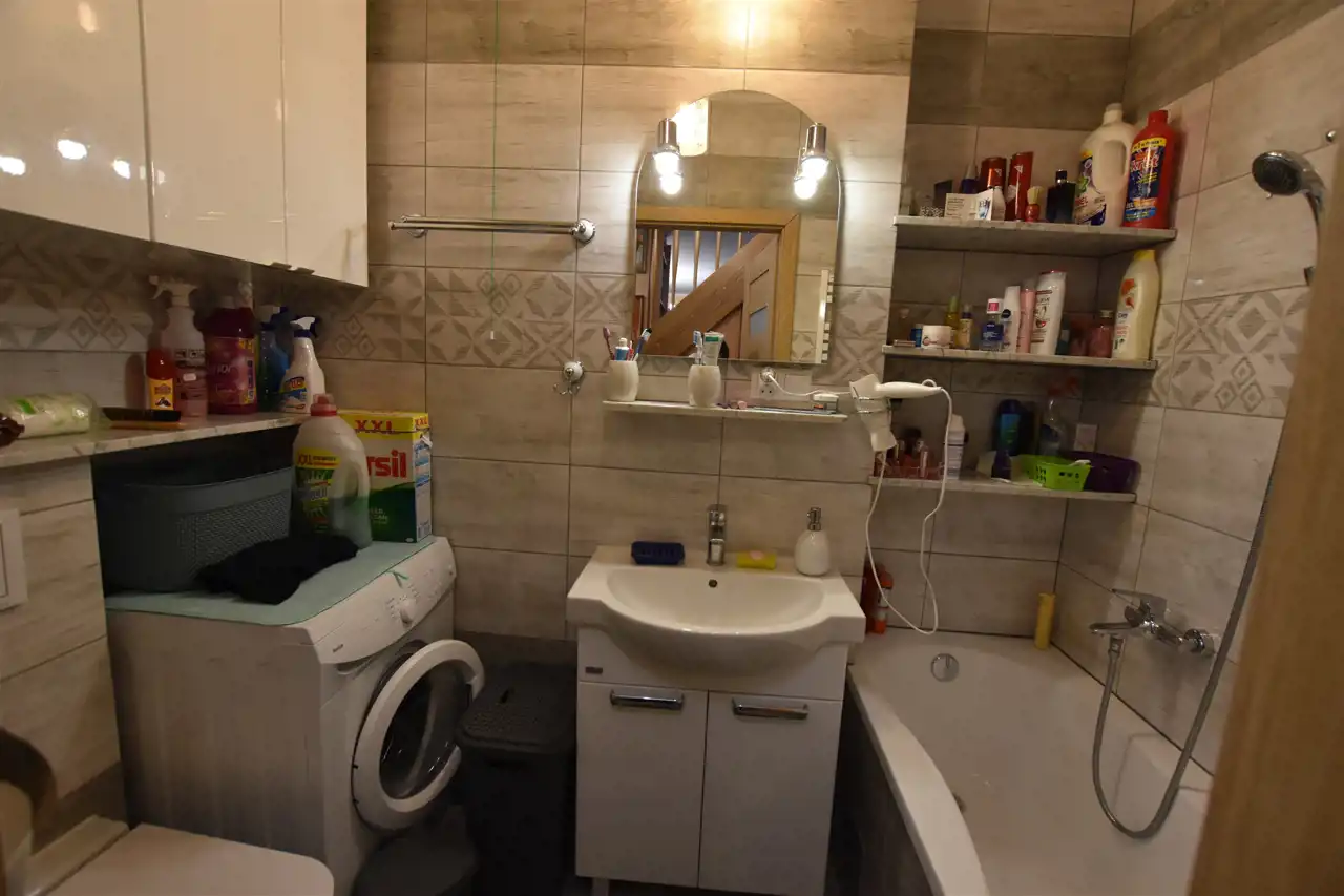 Mieszkanie dwupoziomowe w skład którego wchodzi salon z balkonem, otwarta na salon kuchnia: wyposażona w meble na wymiar, wbudowanym piekarnikiem z mikrofalówką, płytą indukcyjną, zmywarką, lodówką, łazienka z wanną, oraz otwarte poddasze z częścią zagospodarowaną na sypialnię, a także łazienkę z prysznicem. W mieszkaniu znajdują się schody dębowe pod którymi zamontowana została duża szafa. Mieszkanie gotowe do zamieszkania.