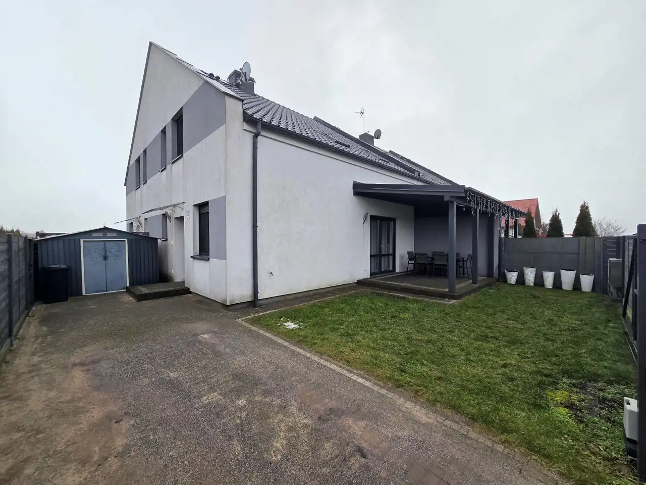 OPIS: nieruchomość wybudowana z dobrej jakości materiałów budowlanych, ocieplona i otynkowana, dach pokryty dachówką ceramiczną. Ogród zagospodarowany, z zadbanym trawnikiem i postawionym domkiem narzędziowym. Teren nieruchomości ogrodzony płotem drewnianym, od frontu zamontowana metalowa brama wjazdowa, sterowana elektrycznie. Chodniki, miejsce postojowe i zadaszony taras wyłożone kostką brukową.