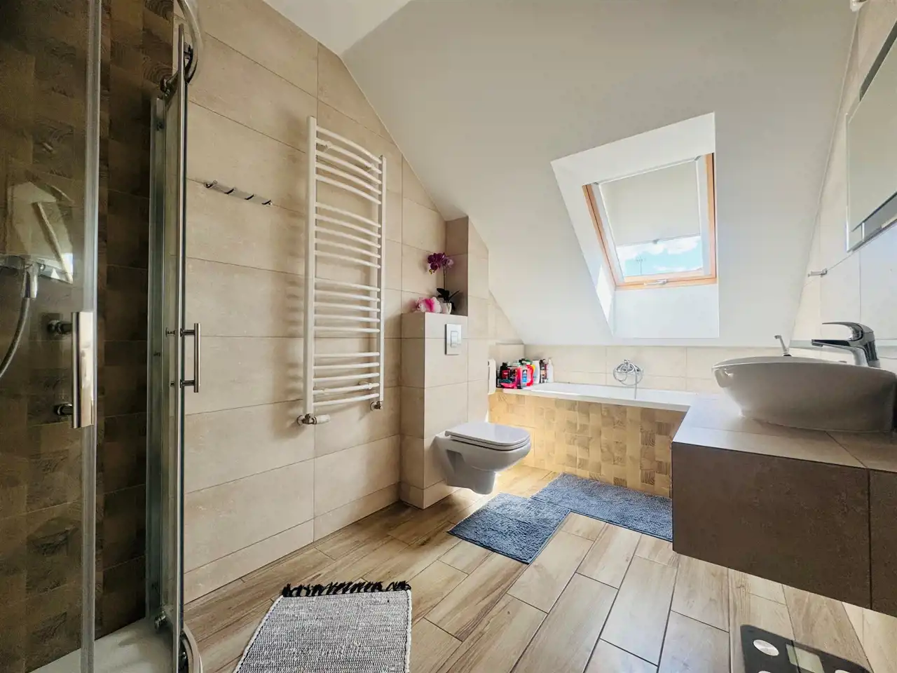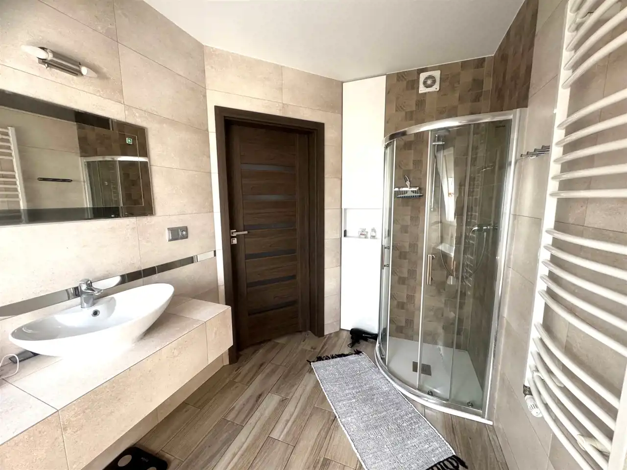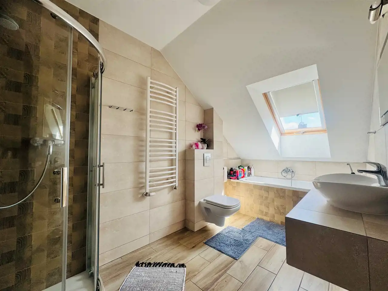 Na poddaszu znajduje się komfortowa łazienka z wanną i prysznicem – wygoda dla całej rodziny.