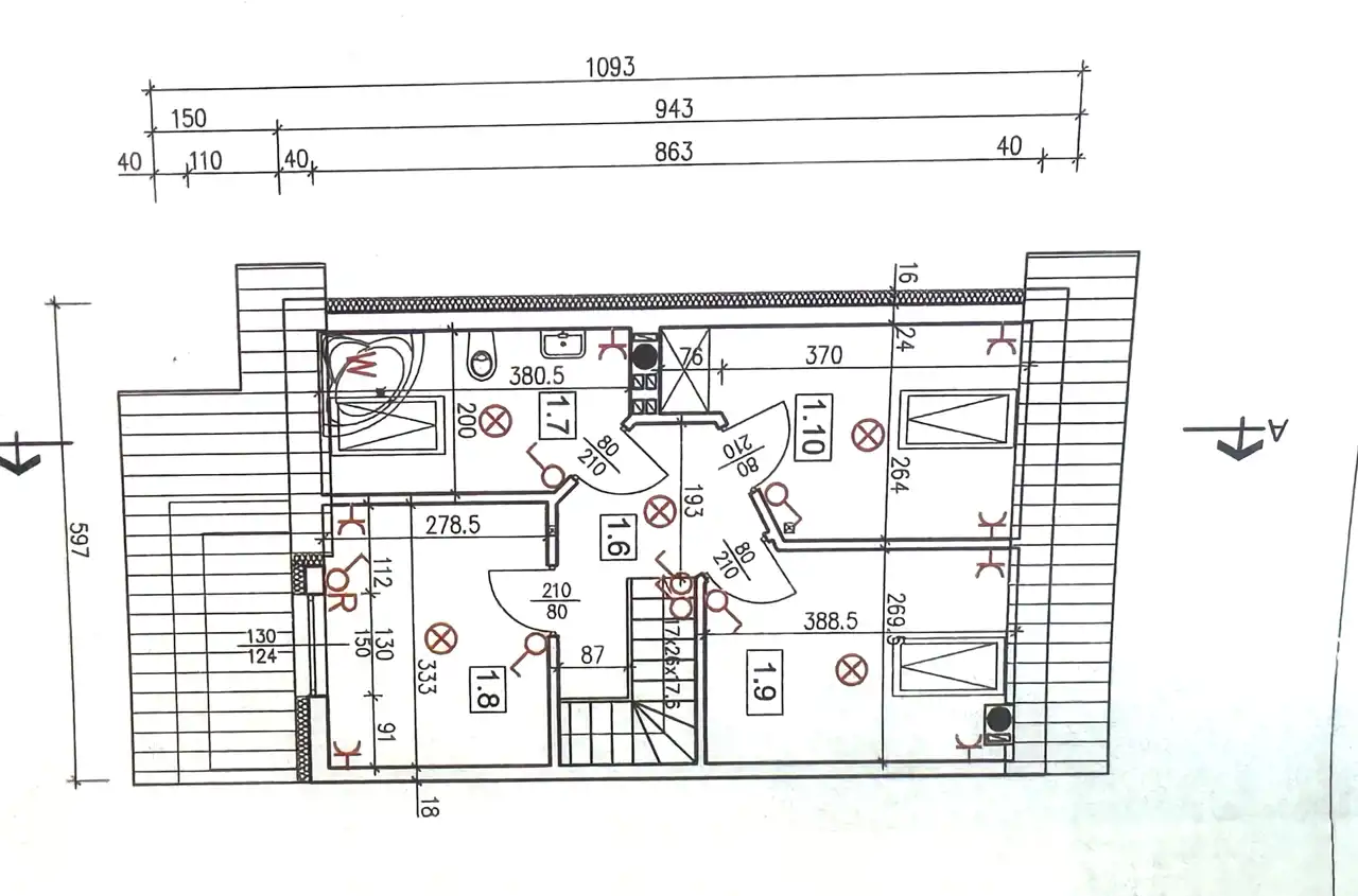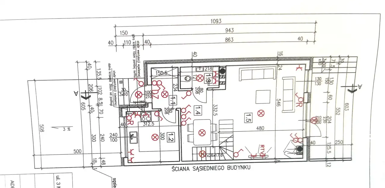 Powierzchnia całkowita około 90 m2 (ze strychem), użytkowa 75 m2.