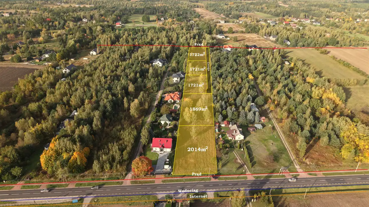 Działka o łącznej powierzchni 10 577 m² jest w trakcie podziału geodezyjnego na pięć działek budowlanych oraz drogę wewnętrzną zakończoną placem do zawracania.