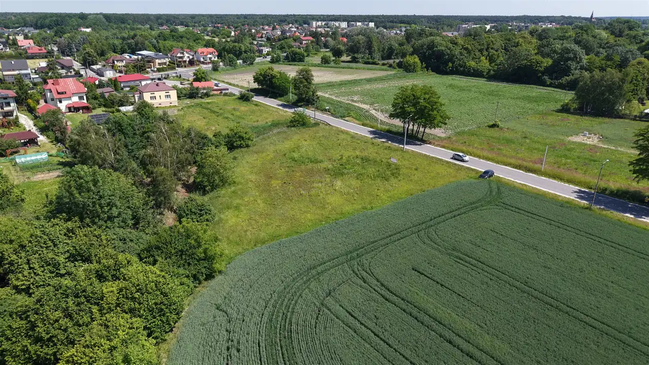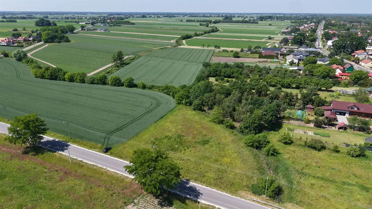 Z frontem o długości 65m, przylegającym do drogi powiatowej.