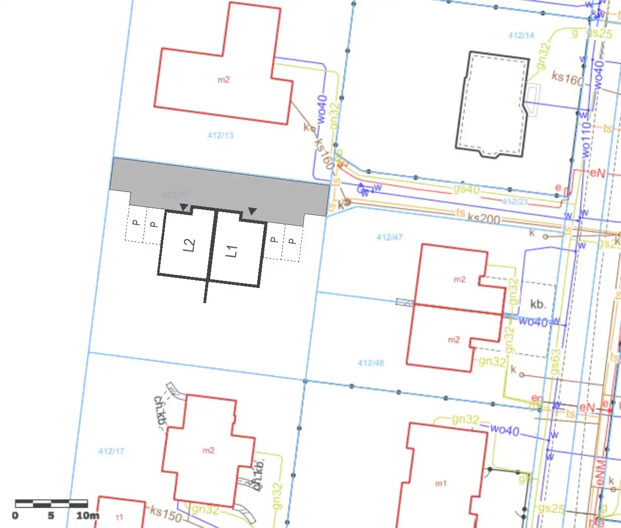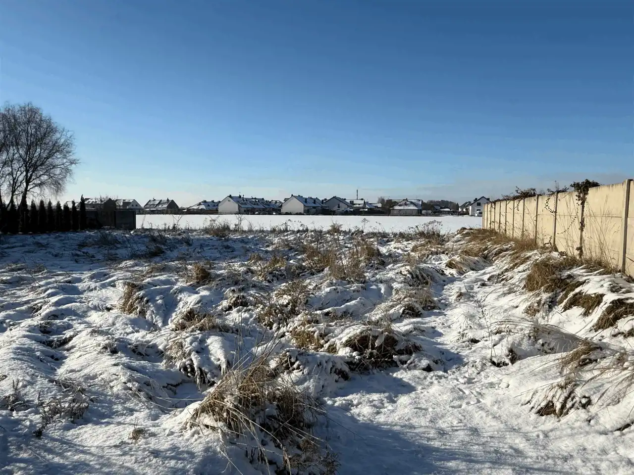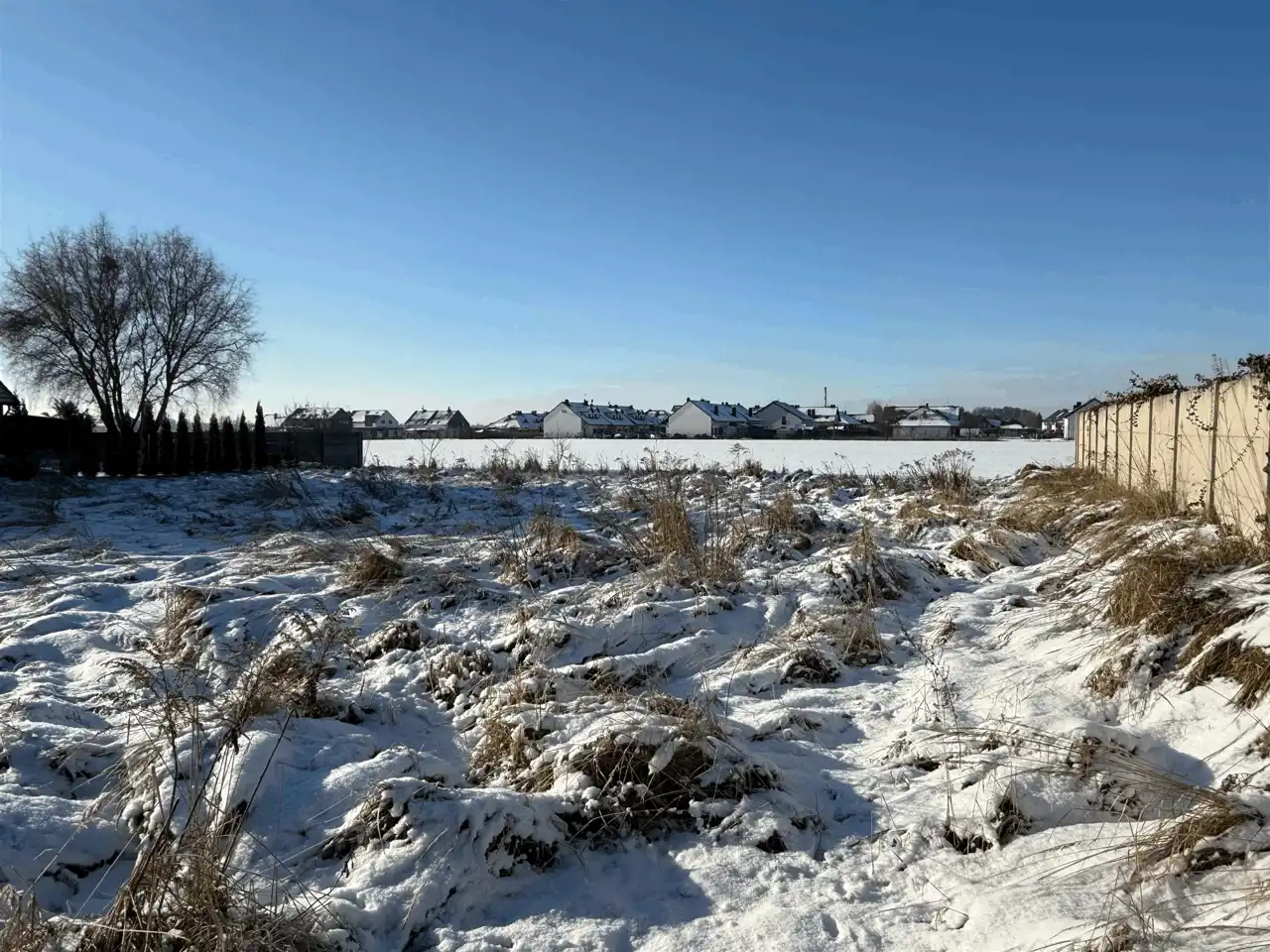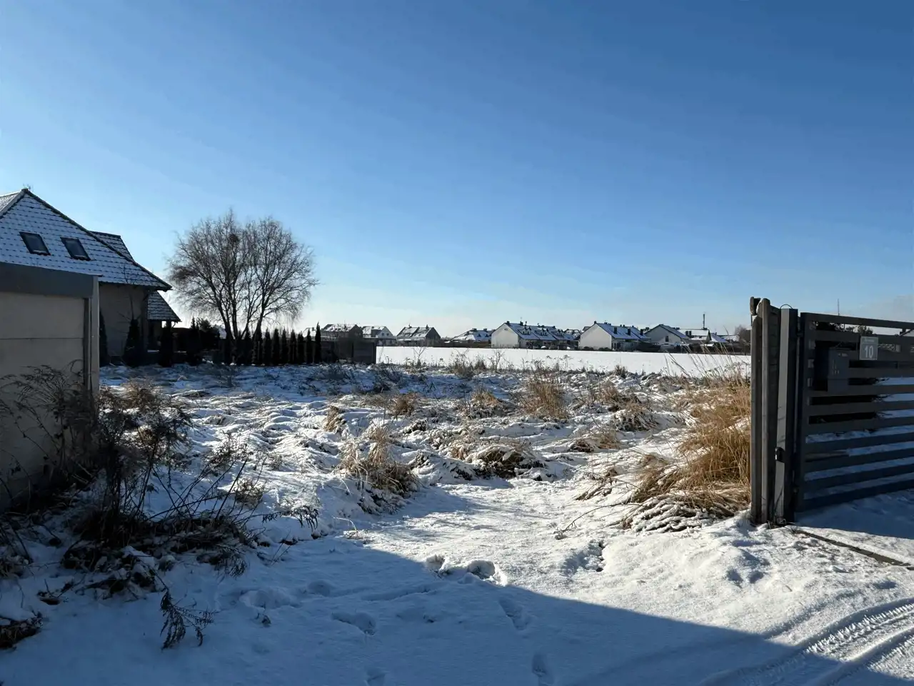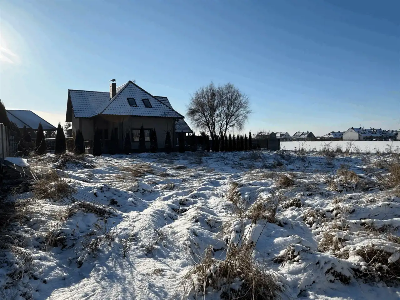 Sąsiednie działki są już zabudowane, co ułatwia zaprojektowanie budynku z optymalnym układem i zachowaniem prywatności.