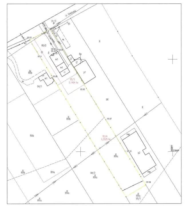 Kształt: prostokąt z dodatkową odnogą dla drogi dojazdowej.