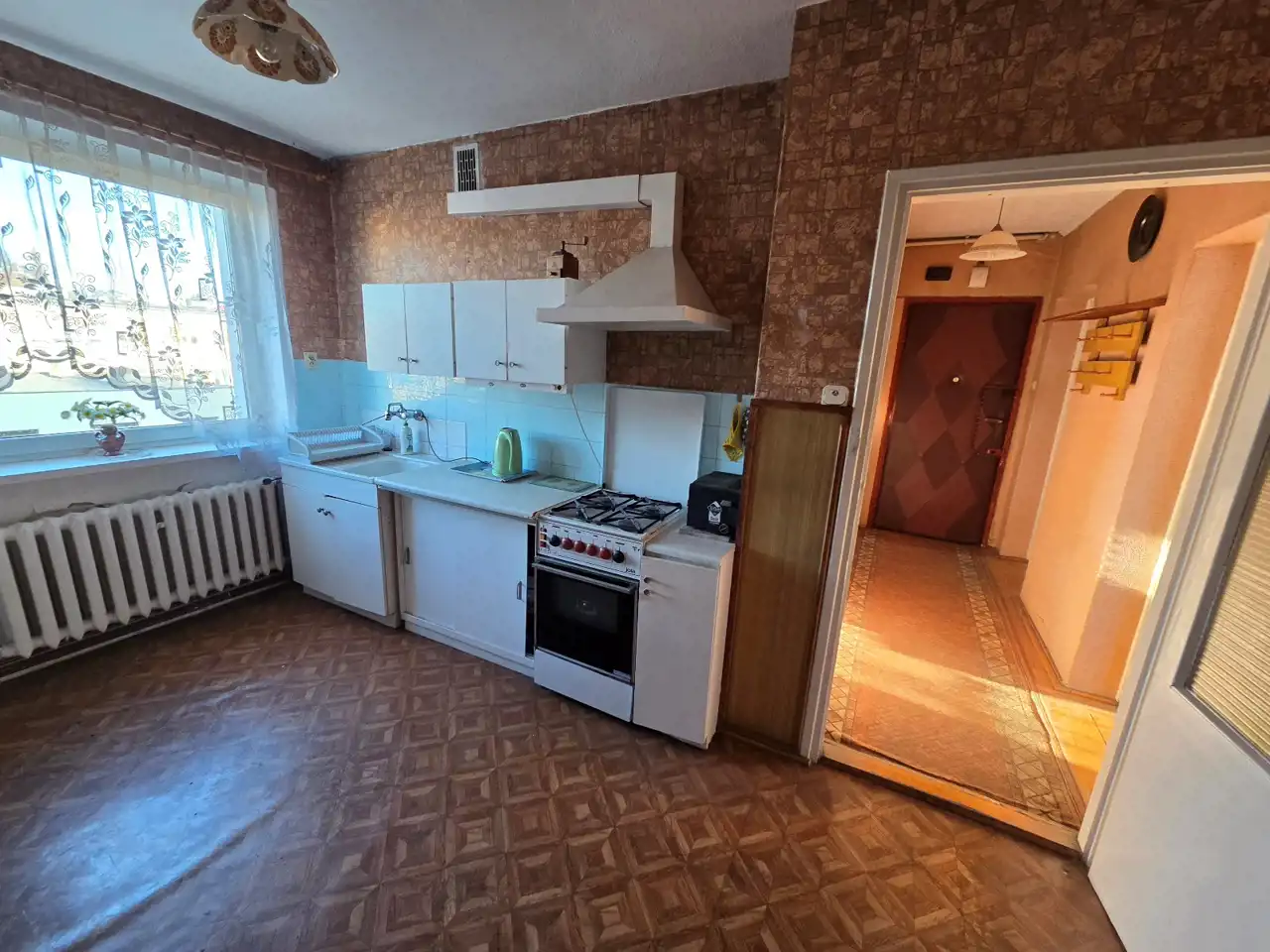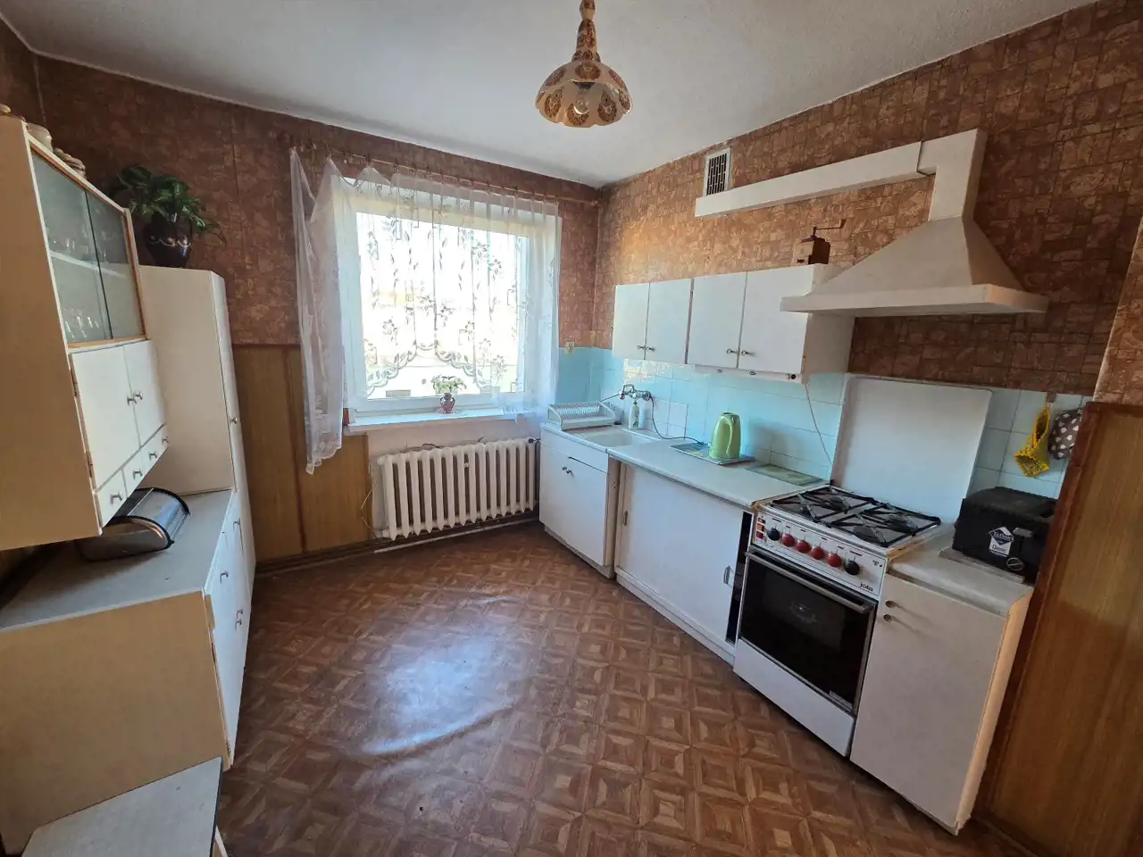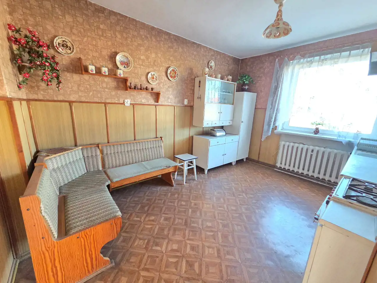 Odrębna kuchnia, wyposażona w zabudowę starszego typu, wyłożona na podłodze wykładziną PCV, na ścianach tapety. Łazienka razem z wc, wyposażona w kabinę prysznicową, umywalkę z szafką, toaletę oraz pralkę automatyczną. Okna PCV, drzwi wewnętrzne i zewnętrzne starszego typu.