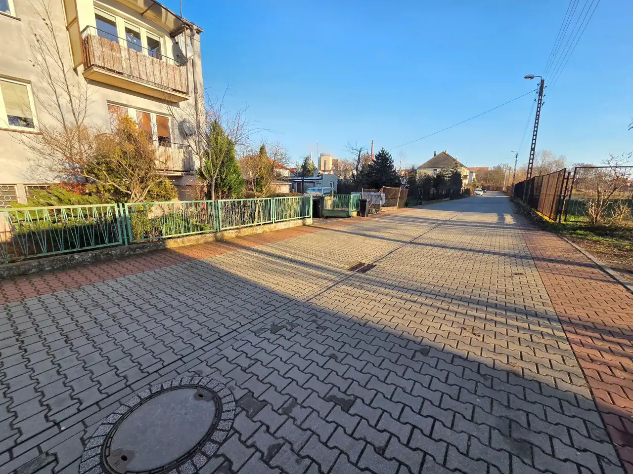 Dojazd do nieruchomości - oświetlona droga, wyłożona kostką brukową.