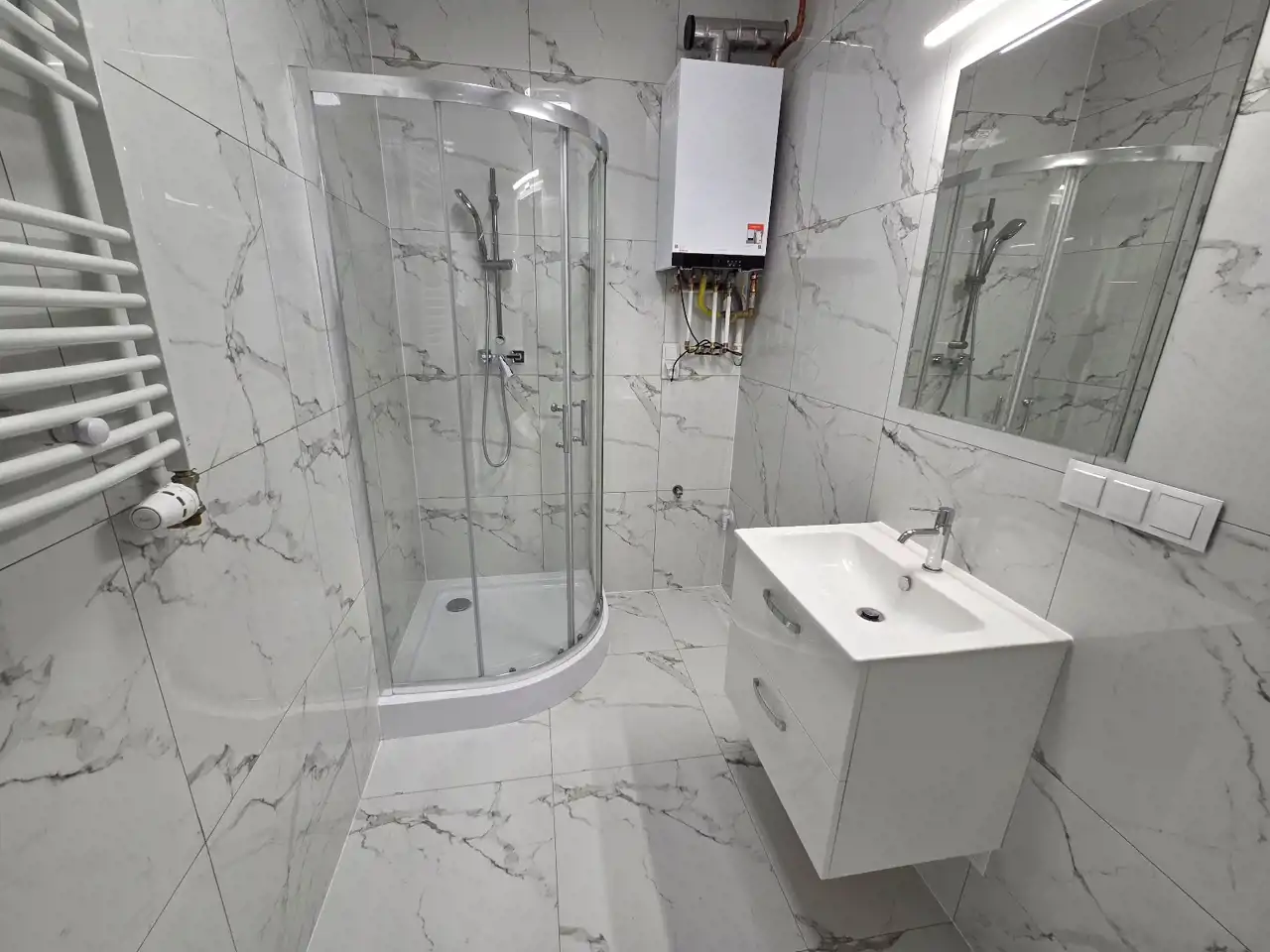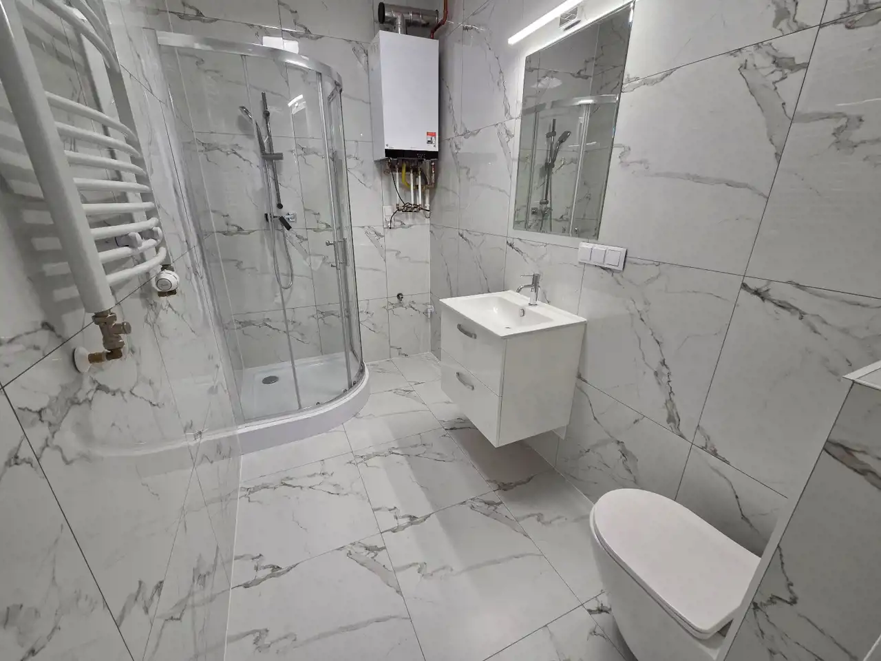 Standard wykończenia: ściany w pokojach malowane na biało, na podłogach panele. Kuchnia wyposażona w nową zabudowę oraz sprzęt AGD (lodówko - zamrażarka, płyta elektryczna, piekarnik). Łazienka razem z wc, wyłożona płytkami ceramicznymi, wyposażona w kabinę prysznicową, umywalkę z szufladami oraz toaletę. Okna PCV, drzwi wewnętrzne nowe w kolorze białym.