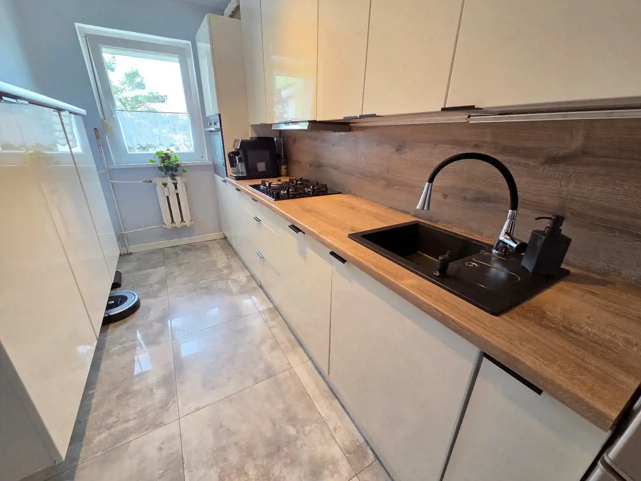 Standard wykończenia: ściany w pokojach malowane, na podłogach panele. Kuchnia wyłożona płytkami ceramicznymi, wyposażona w zabudowę oraz sprzęt AGD (lodówko - zamrażarka, kuchenka gazowa, okap, piekarnik, zmywarka). Łazienka wyposażona w kabinę prysznicową, umywalkę z szufladami i toaletę, wyłożona płytkami ceramicznymi. Okna PCV z roletami zewnętrznymi, drzwi wewnętrzne i zewnętrzne w okleinie drewnianej.