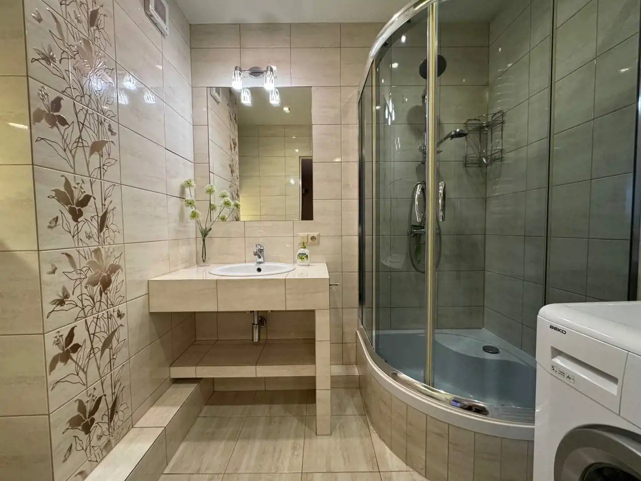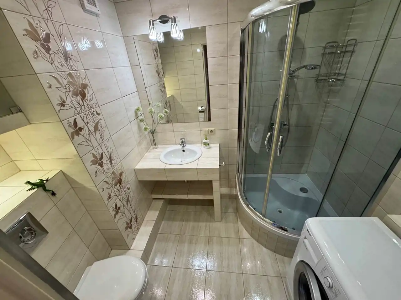 - łazienka: przytulna i ustawna, prysznic, WC z deską wolnoopadającą, umywalka z półkami na kosmetyki, ręczniki; nad toaletą poręczna szafka również na art. gospodarstwa domowego, zapasowe ręczniki, papier itp.