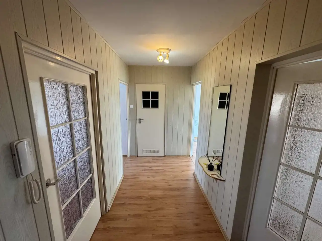 - na podłogach panele w pokojach i przedpokoju;