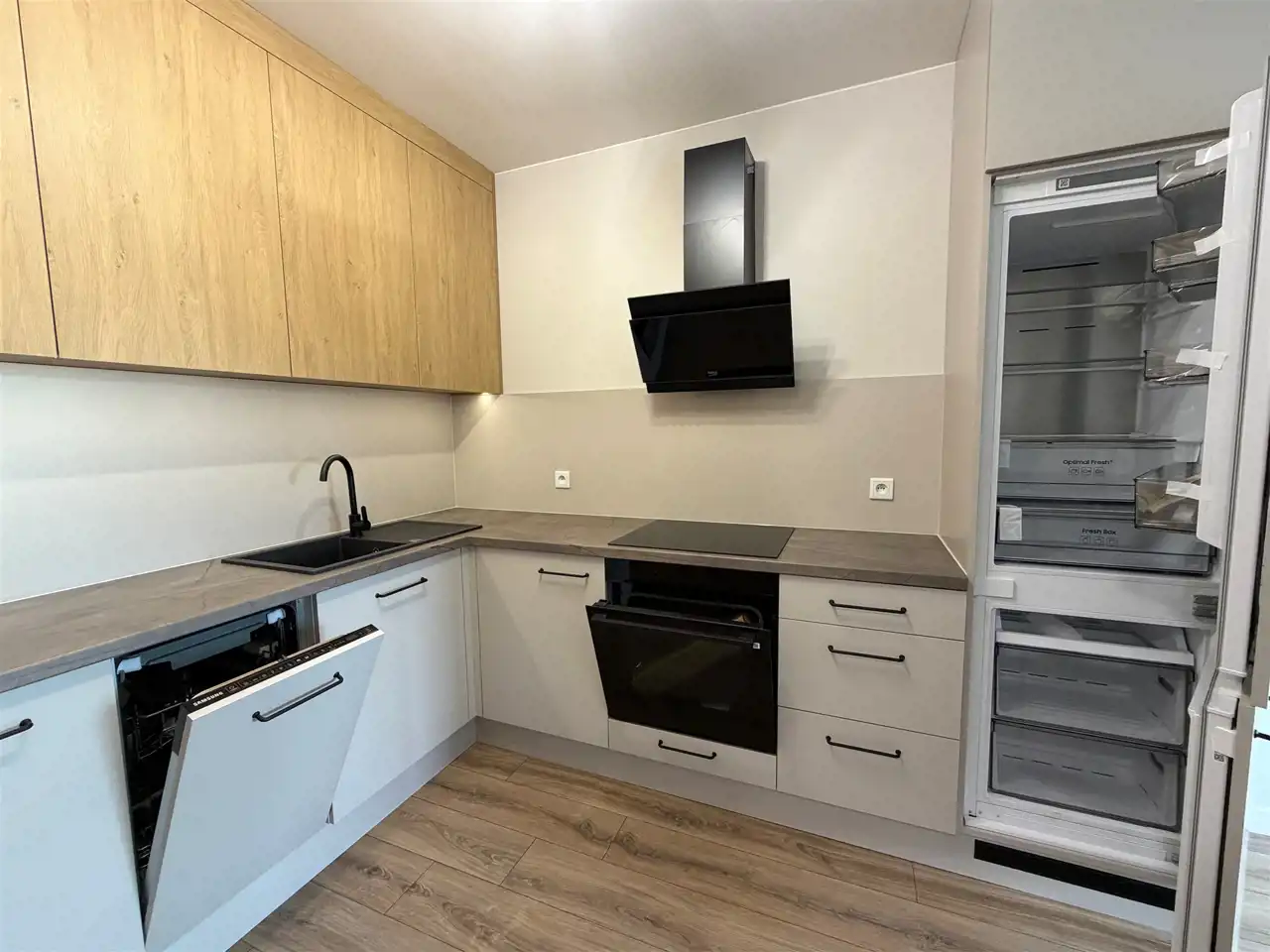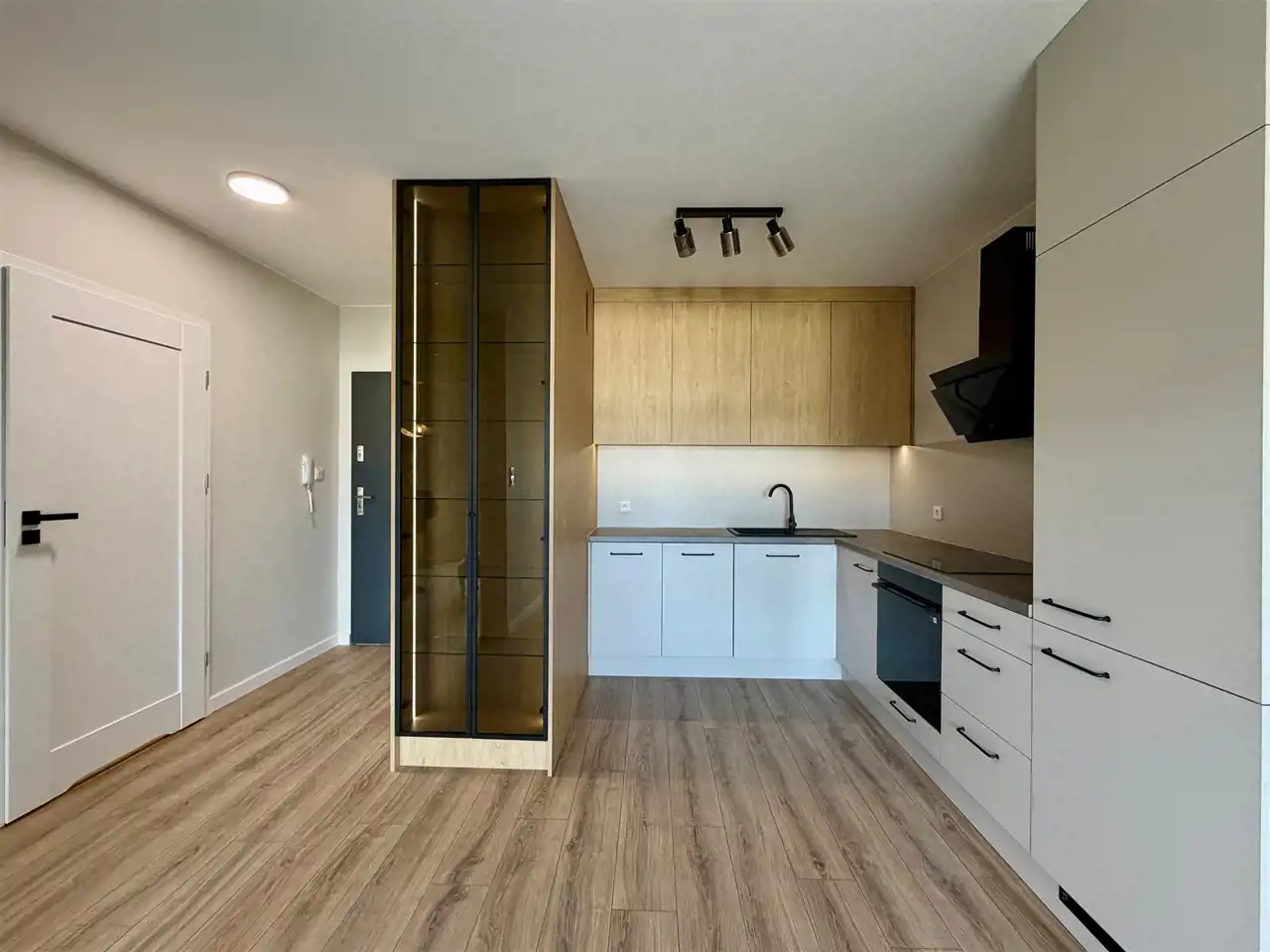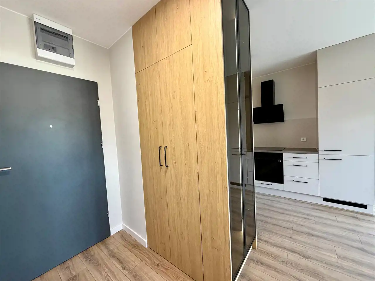 W cenie pozostaje zabudowa kuchenna wykonana przez stolarza w modnym połączeniu kaszmiru i ciepłego drewna, wraz ze sprzętem AGD firmy Samsung (płyta indukcyjna, piekarnik, zmywarka, duża lodówka oraz okap), duża podświetlana, przeszklona szafa, w przedpokoju pojemna szafa.
