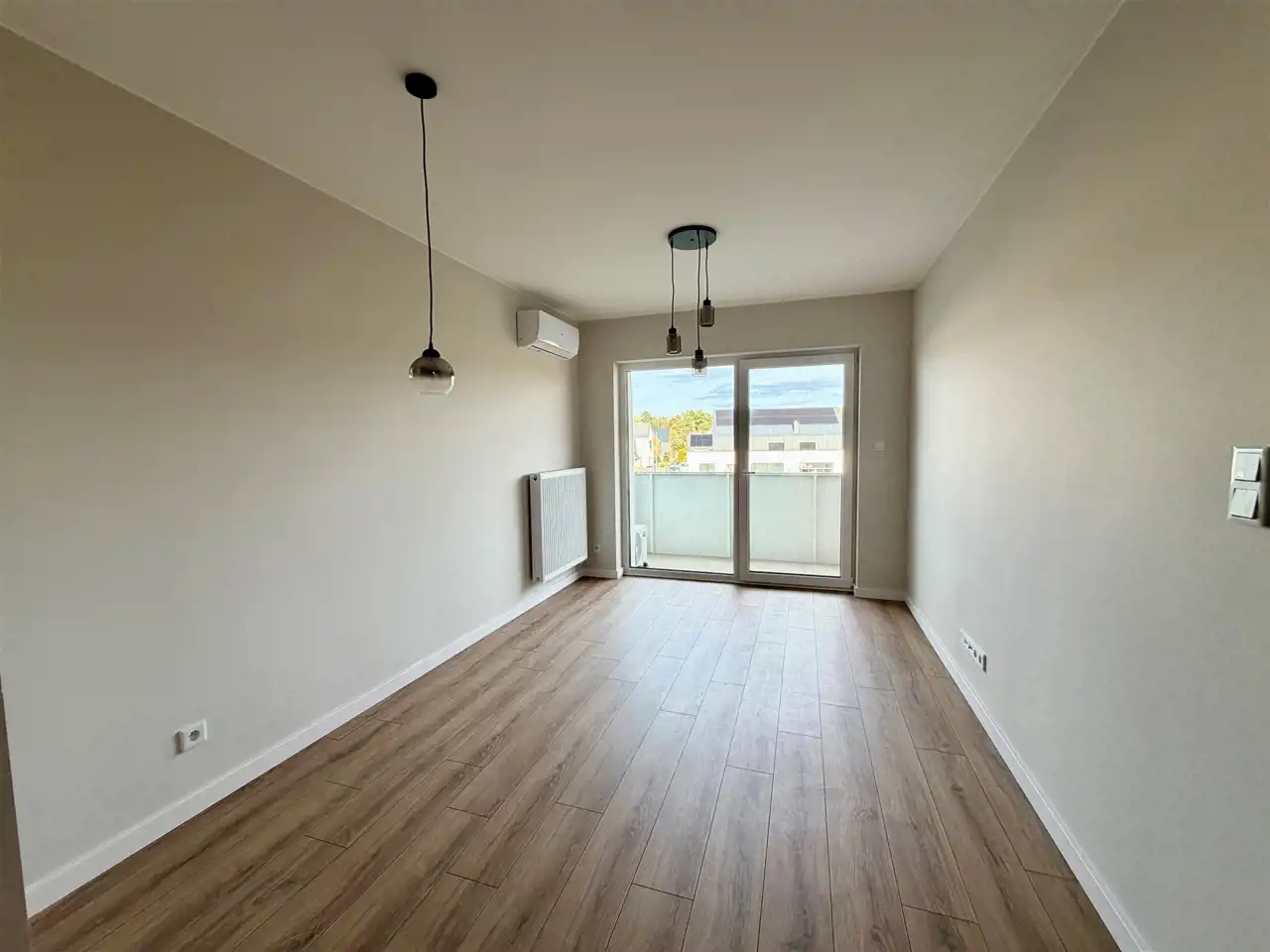 Przestronny salon z aneksem kuchennym i wyjściem na duży balkon,